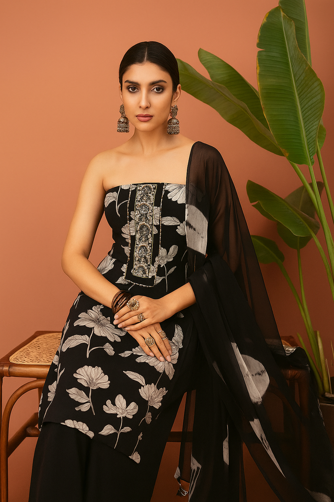 Elevate your ethnic wardrobe with this elegant black unstitched cotton suit. Designed for both comfort and style, the fabric is adorned with a printed pattern beautifully highlighted by thread embroidery, beadwork, sequins, zari, and gota patti. The intricate embellishments add a touch of glamour, making it a perfect choice for festive occasions, celebrations, or evening gatherings.
