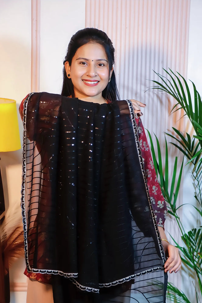 Drape yourself in timeless elegance with this stunning Black Georgette Saree, designed for those who love effortless glam. Crafted from soft, flowy georgette, it features delicate sequin, Cutdana, and Nag work that adds the perfect touch of shimmer without overpowering the look.