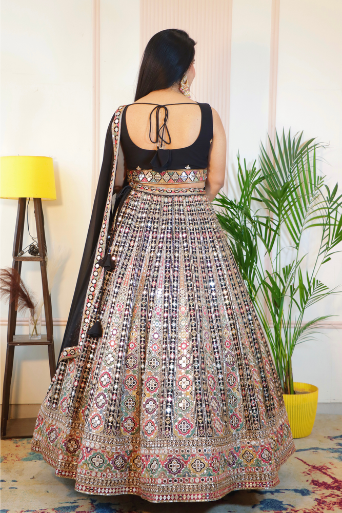 Step into timeless elegance with this stunning Black Georgette Lehenga, crafted to perfection for weddings and festive celebrations. Designed in lightweight georgette, the lehenga drapes gracefully while ensuring comfort throughout the day. The intricate Gota Patti detailing, Metallic Mirror embellishments, and delicate Pearl work create a royal blend of tradition and glamour.