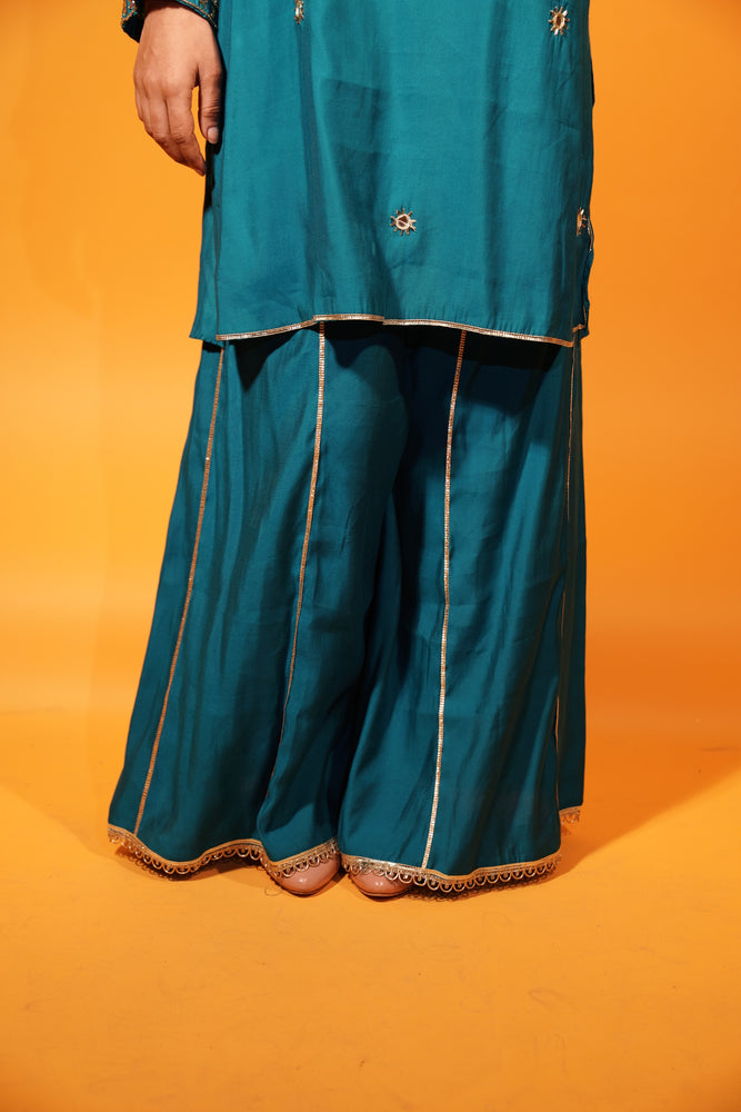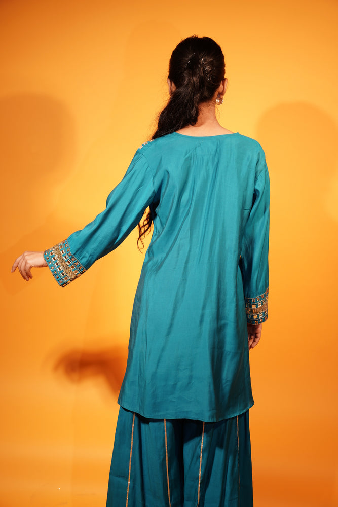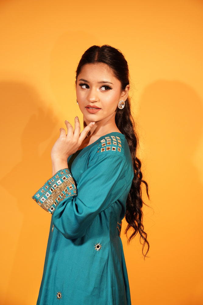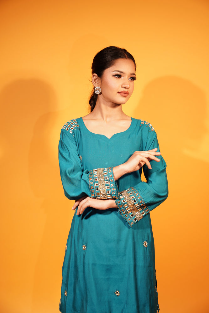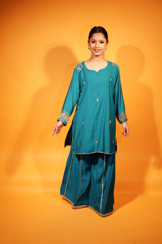 Daisy Fashion brings you style in comfort and elegance with the serene blue cord set in mirror work. The Rayon Silk fabric feels soft and is designed to take you from the office to an evening out effortlessly.