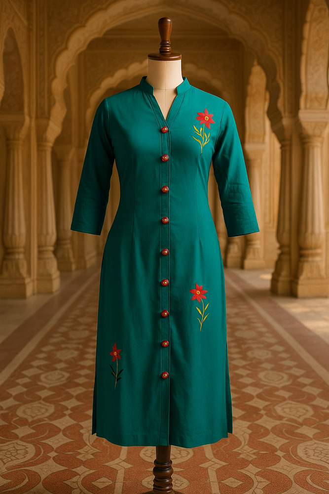Grace your everyday style with the understated elegance of our Emerald Blossom Button-Down Kurti. Crafted from premium cotton fabric, this elegant piece features a rich emerald green hue adorned with delicate floral embroidery that adds a touch of handcrafted charm.