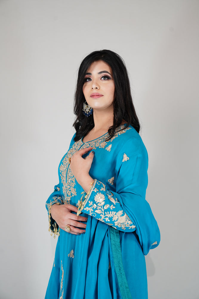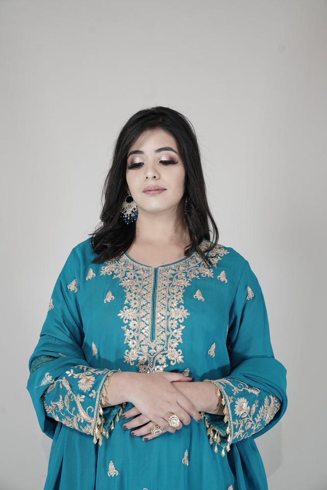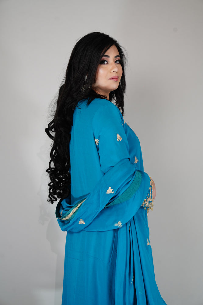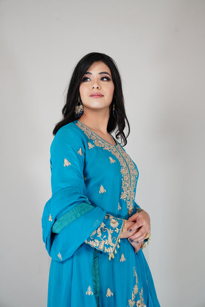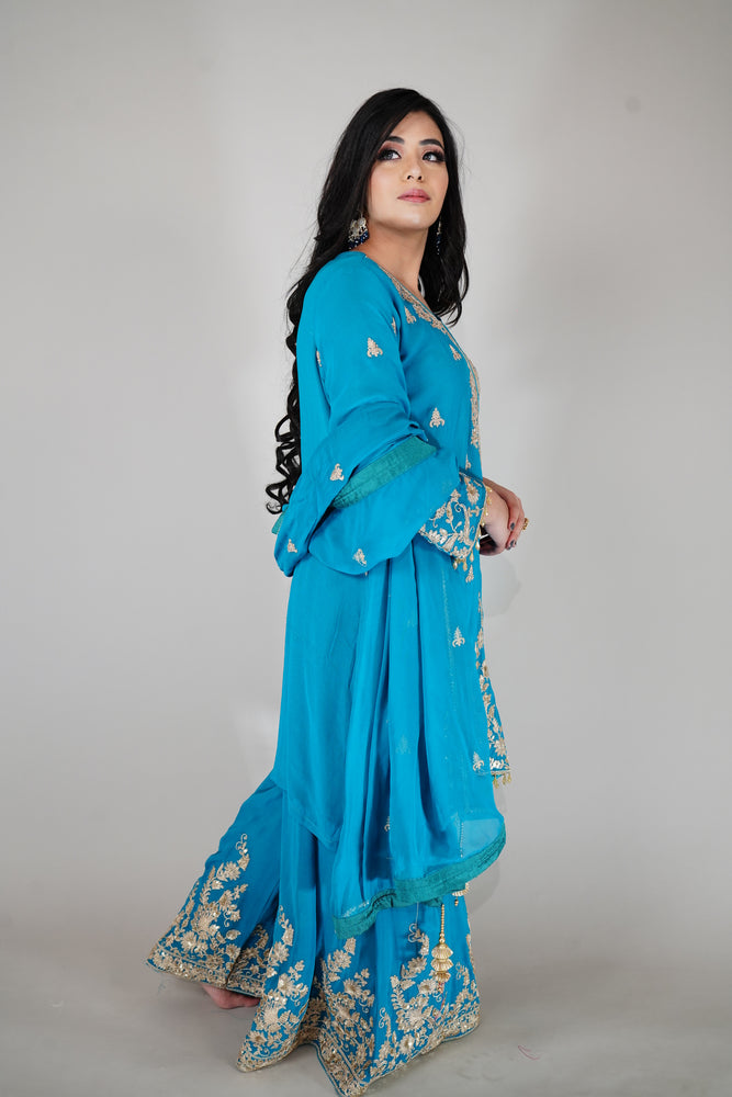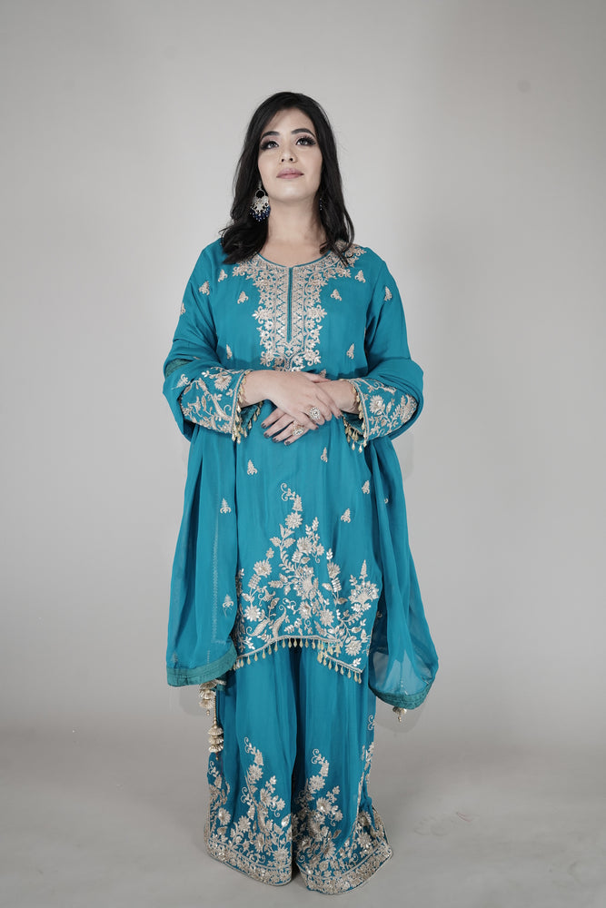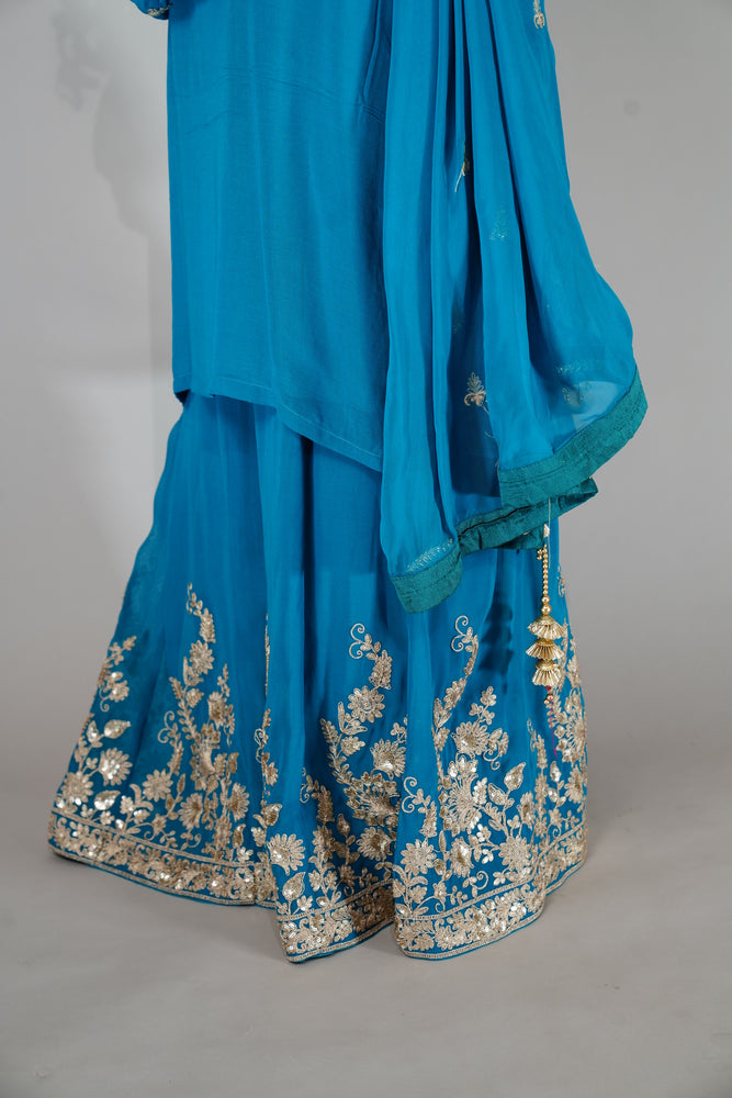 This elegant blue set includes a kurti, palazzo and dupatta, all made from soft and flowy georgette fabric. The outfit is beautifully designed with dori, zari, and sequins work, giving it a festive and stylish look. Perfect for weddings, parties, or special occasions. Pair it with traditional accessories for a graceful look! Elevate the beauty of this class outfit with heels.