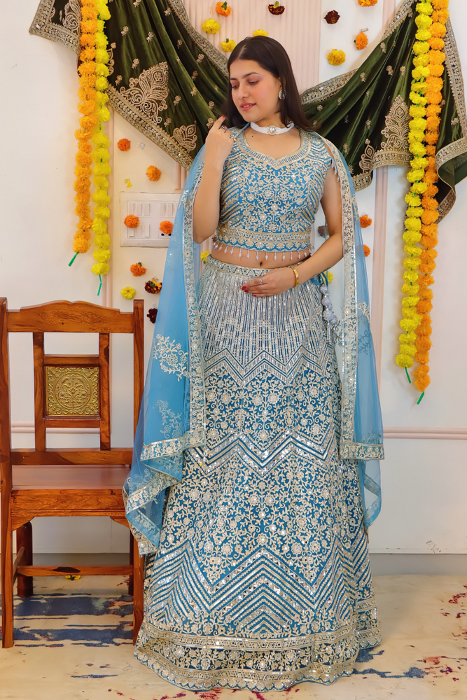 A blue and ivory lehenga set featuring intricate floral and geometric