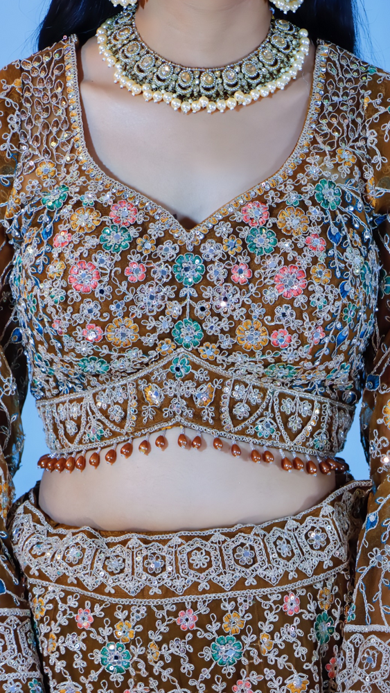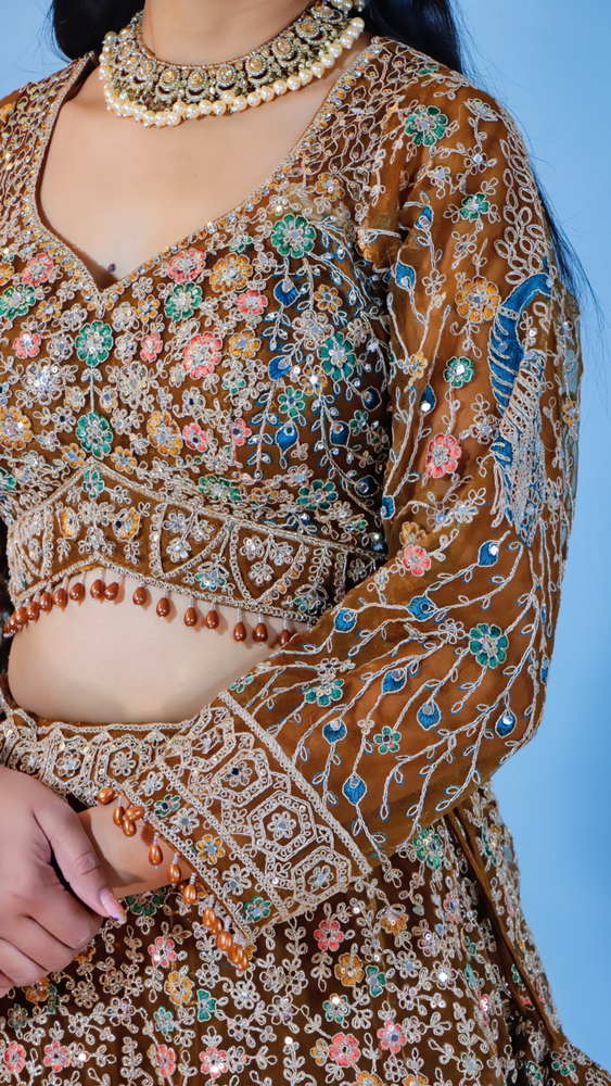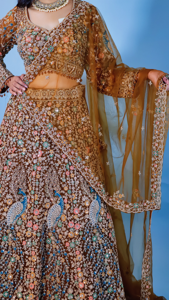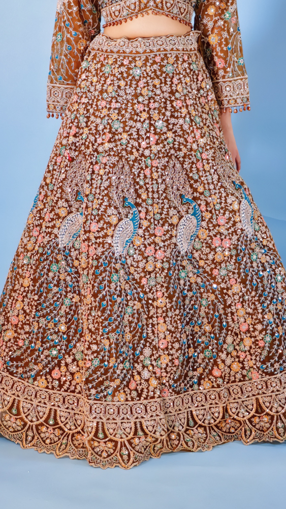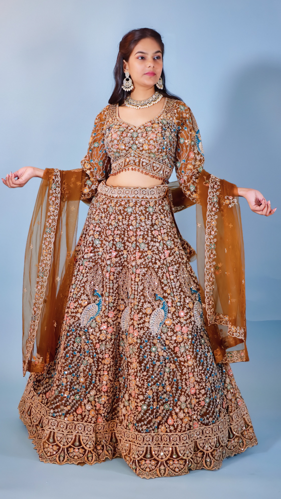 Step into your wedding celebrations with timeless grace in this Brownish Golden Bridal Lehenga, crafted to perfection in soft net fabric. The lehenga is adorned with exquisite Thread Embroidery, intricate Zari detailing, shimmering Nag work, and delicate Pearl embellishments, making it a true masterpiece of craftsmanship.