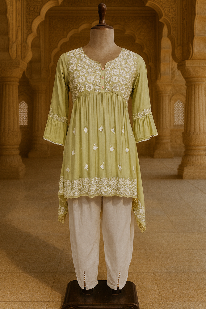 Step into effortless elegance with this Olive Green & White Co-ord Set, crafted in soft cotton rayon for all-day comfort. The set is beautifully detailed with delicate thread embroidery, giving it a refined yet contemporary appeal. Perfect for festive gatherings, casual outings, or statement everyday wear, this co-ord set blends tradition with modern style.