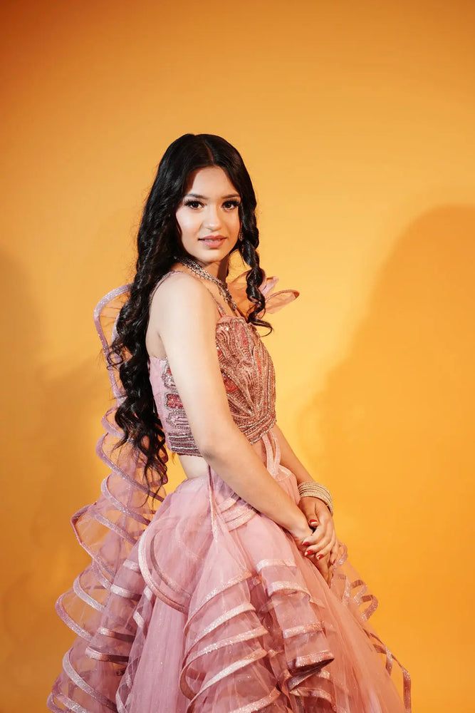 Steal the spotlight at your engagement or Reception with the dazzling Designer Western Crop top lehenga. The crop top has luxe sequins and dreamy details of beads and stones. The ruffle on the shoulders add uniqueness to the outfit and makes you stand out. The Crop top lehenga has Net and shimmer lycra in pink color fabric with attached can-can.