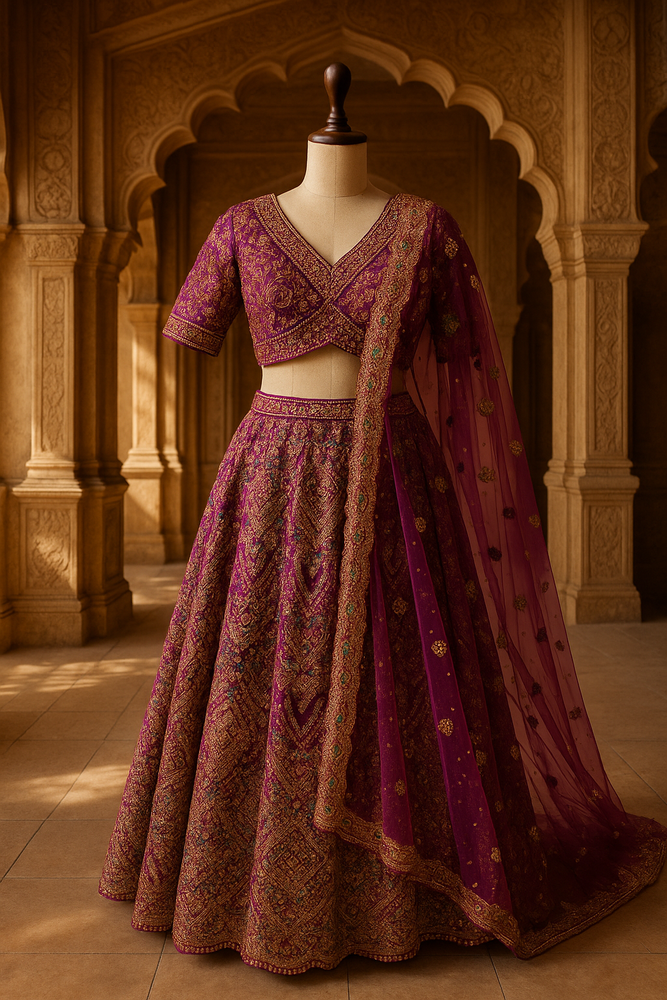 The lehenga is adorned with all-over thread embroidery, enhanced with shimmering sequins, rich zari highlights, mirror accents, and intricate nag work, creating a mesmerizing interplay of texture and sparkle. The wine purple hue exudes sophistication and royalty, offering a striking alternative to traditional bridal and festive colours.
