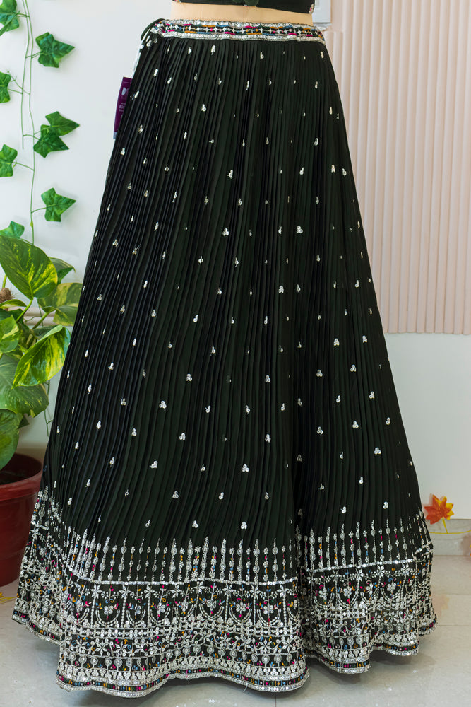The lehenga is intricately adorned with zari embroidery, shimmering sequins, and delicate thread work, creating a luxurious design that sparkles with every movement. The deep green hue adds a regal charm, making it an ideal choice for weddings, receptions, and festive celebrations.