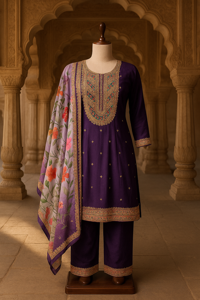 Step into elegance with this stunning Frock Style Kurti set, crafted in a luxurious Cotton Silk Blend fabric that ensures both comfort and sophistication. The outfit features intricate Thread Embroidery, Dori, Zari, and Sequins work in a regal purple shade, adding a rich traditional charm.