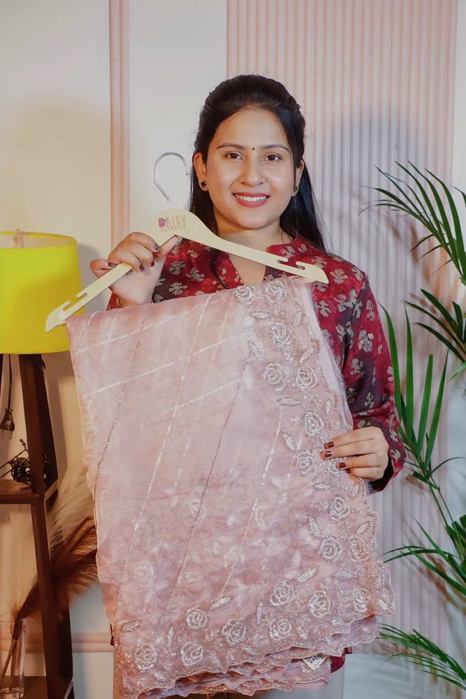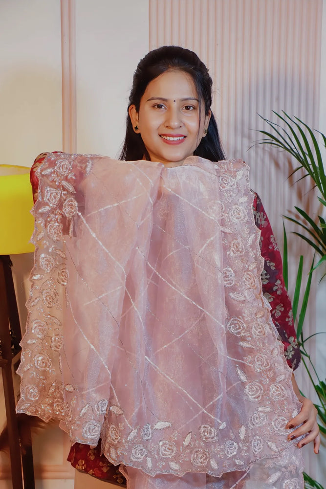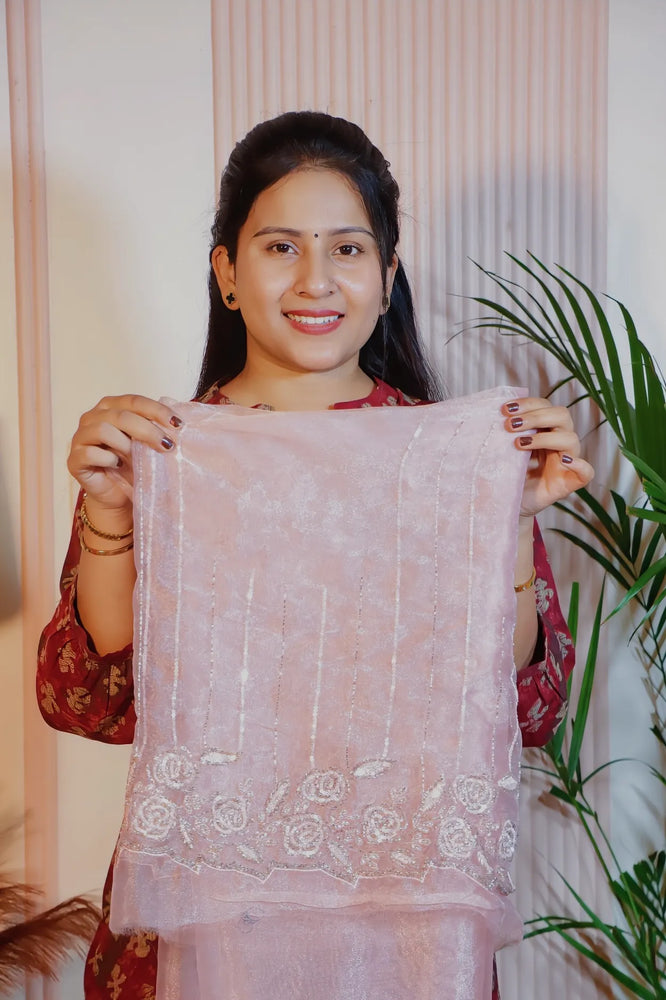 Elevate your festive and bridal wardrobe with this stunning Dusky Pink Shimmer Net Saree. Crafted from premium shimmery net fabric, it drapes beautifully and exudes a soft, radiant glow. The saree is adorned with intricate all-over Cutdana, Beads, and Sequins work, adding a luxurious sparkle to every movement.