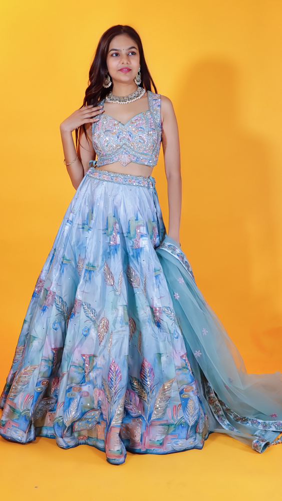Make a statement with this stunning Blue Silk Blend Lehenga, designed for those who love a perfect blend of tradition and glamour. Crafted from luxurious silk blend fabric, this lehenga features intricate thread embroidery, dazzling mirror work, and subtle foil prints that add a sparkling dimension to your look. The vibrant blue hue enhances its regal charm, making it ideal for weddings, festive occasions, or special celebrations. Pair it with a matching blouse and dupatta to complete your elegant ensemble.