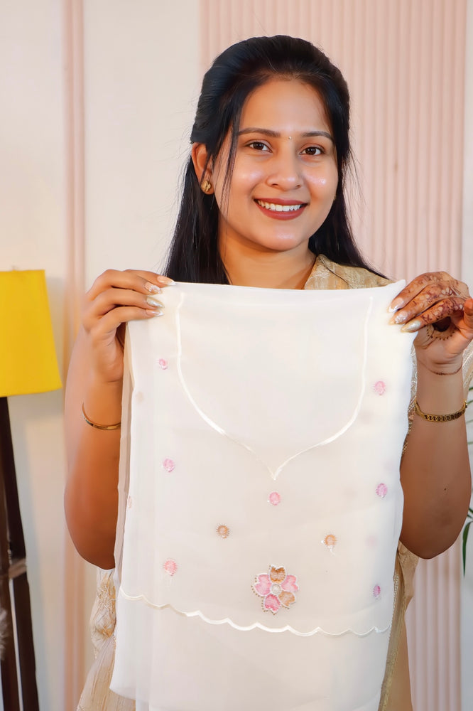 Radiate timeless grace in this exquisite Cream Crust Saree, adorned with intricate thread embroidery, shimmering sequins, and delicate Siroski detailing. The soft Crust fabric drapes beautifully, making it perfect for weddings, receptions, and festive occasions. A blend of sophistication and sparkle, this saree is sure to make you shine effortlessly.