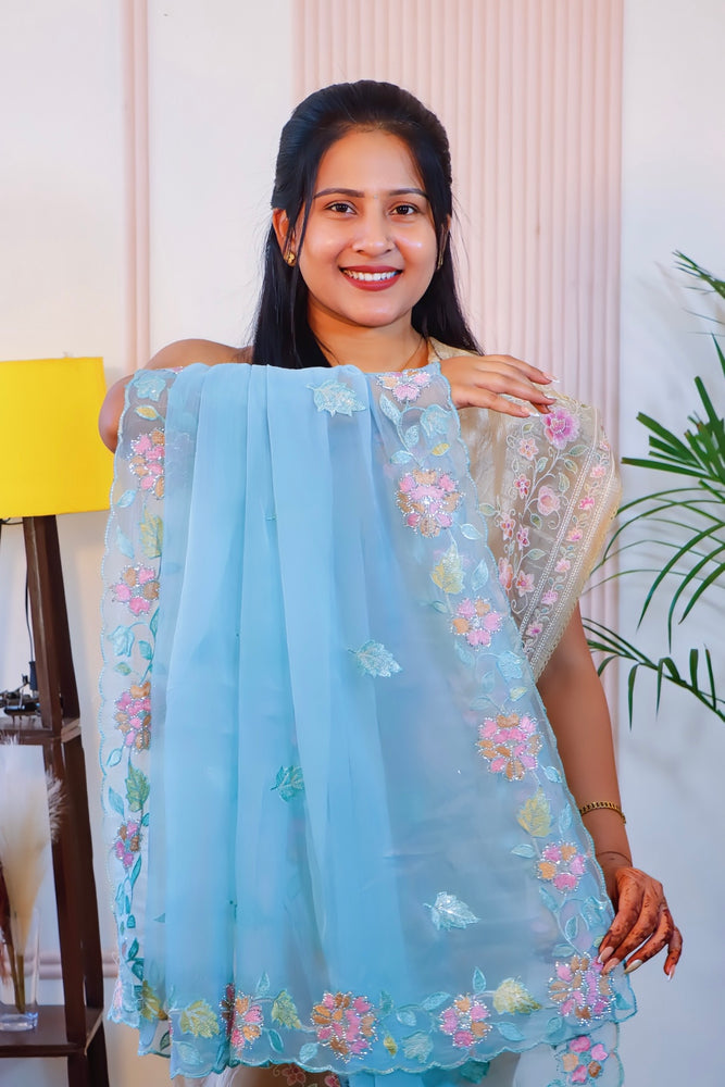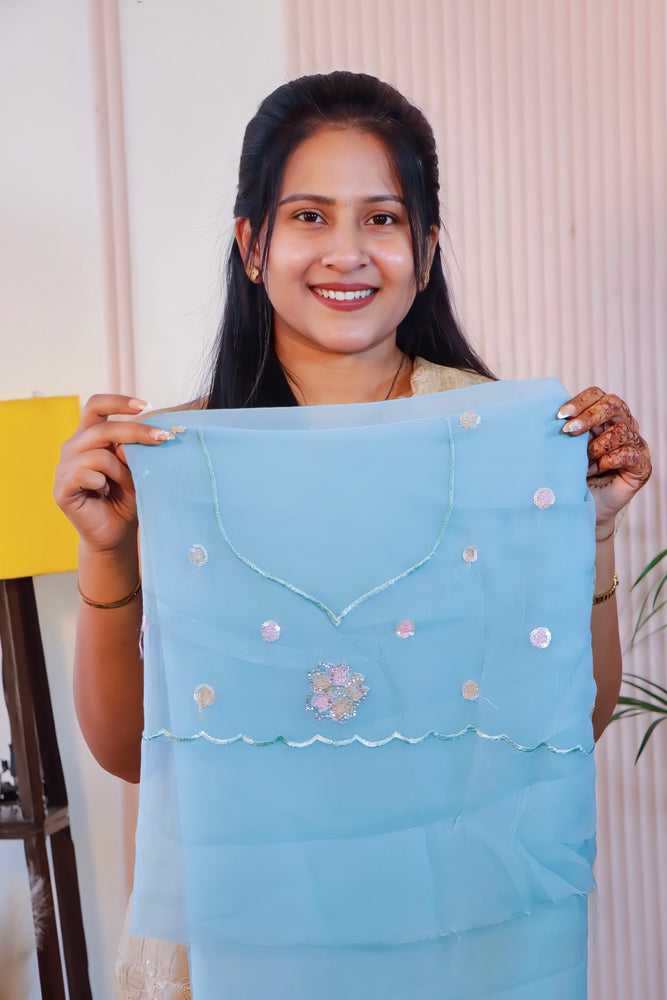Radiate timeless grace in this exquisite Firozi Crust Saree, adorned with intricate thread embroidery, shimmering sequins, and delicate Siroski detailing. The soft Crust fabric drapes beautifully, making it perfect for weddings, receptions, and festive occasions. A blend of sophistication and sparkle, this saree is sure to make you shine effortlessly.