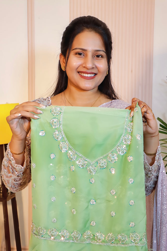 Embrace timeless elegance with this stunning Pista Pure Silk Saree, beautifully adorned with intricate bead and sequin work. The rich silk fabric drapes gracefully, adding a luxurious touch to your look. Perfect for weddings, festive celebrations, or special occasions, this saree is a true blend of sophistication and charm.
