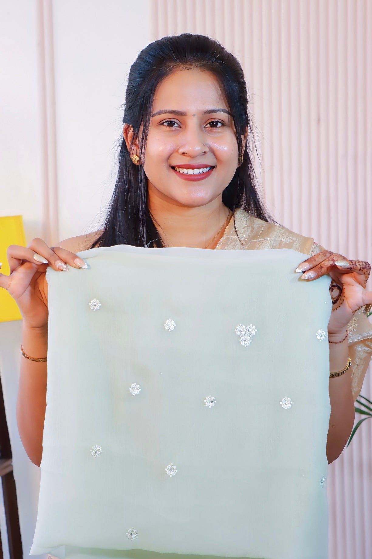 Drape yourself in effortless elegance with this stunning Tissue Georgette saree. Crafted for a graceful fall and soft shimmer, it beautifully blends traditional charm with modern sophistication. Perfect for festive occasions and celebrations, this saree adds a refined touch to your ethnic wardrobe.