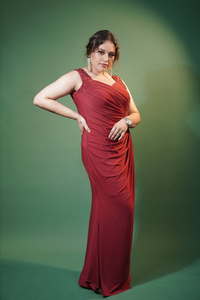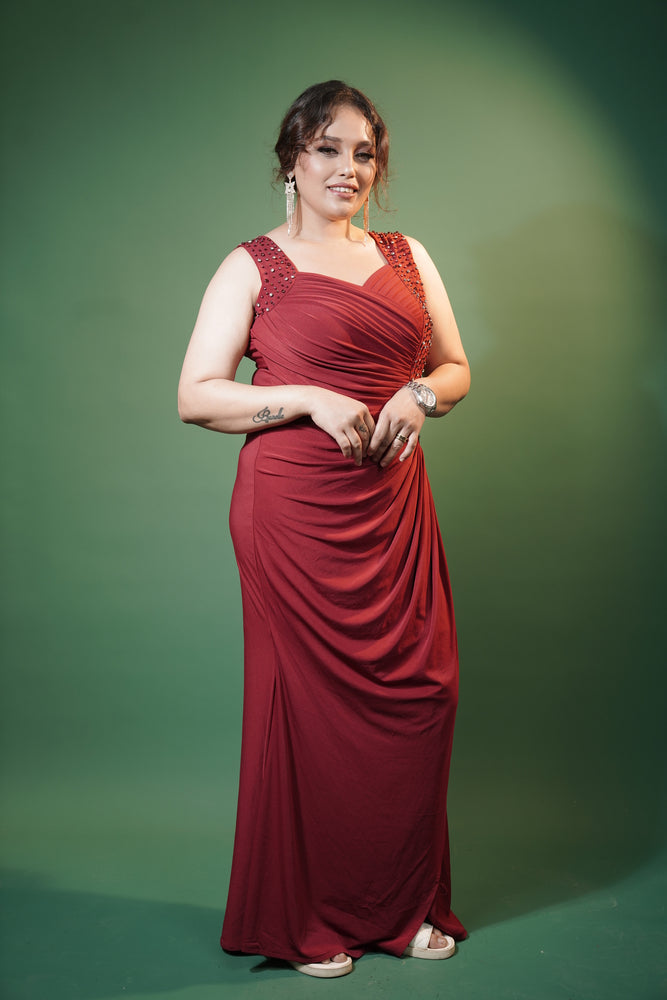 Featuring a flattering neckline, a flowing silhouette, and intricate embellishments, this maroon evening gown is the perfect blend of modern allure and timeless elegance.