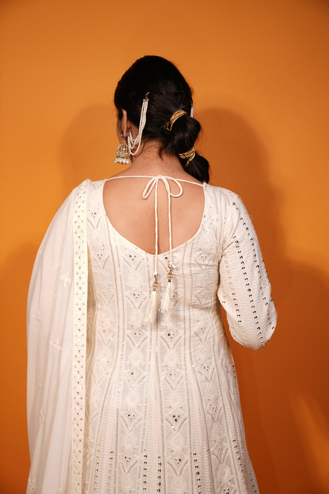 Look elegant and stylish in this Off White Floor-Length Frock Style Suit made from soft and flowy Georgette fabric. It features beautiful Chikankari embroidery all over, with shiny sequins that add a touch of sparkle. The neckline is decorated with delicate handwork, making it perfect for festive occasions or special events. This outfit is a lovely mix of tradition and charm and a must have outfit.