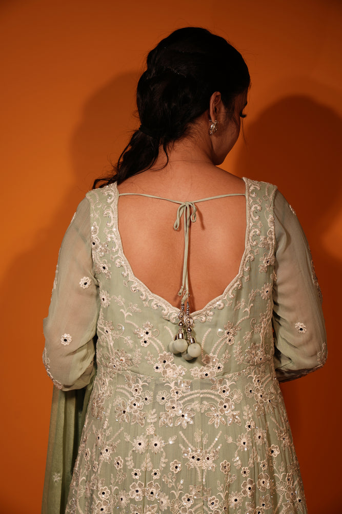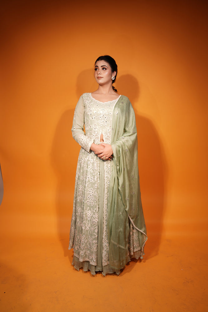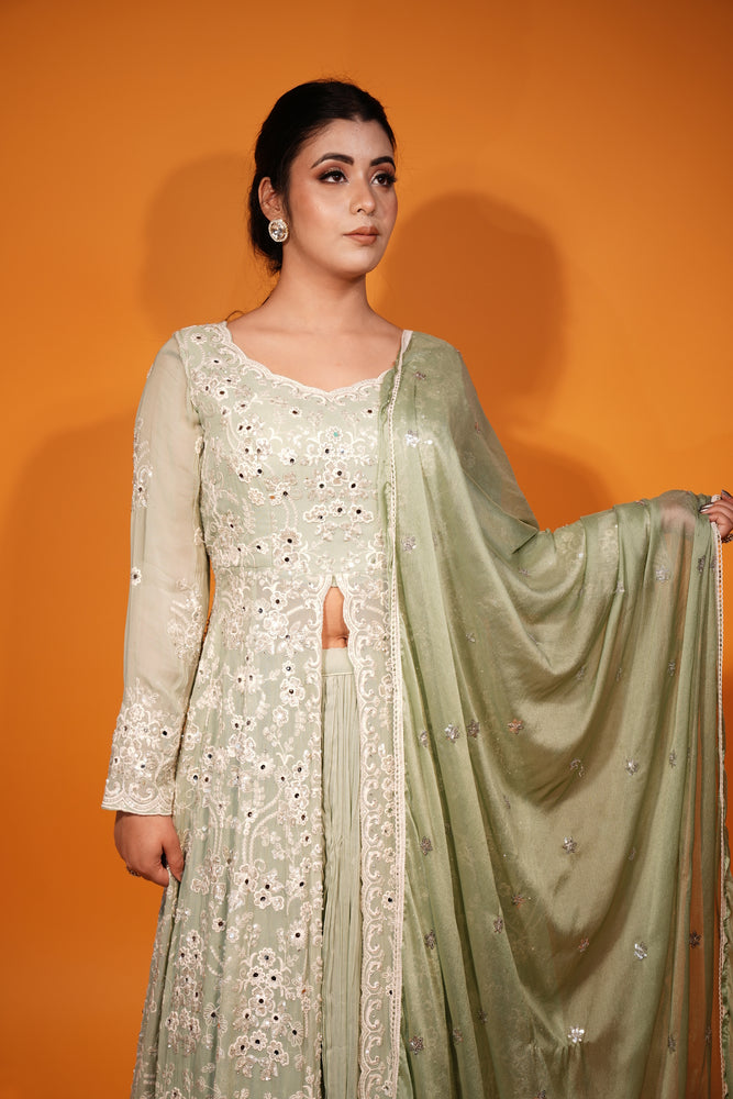 Elegance Crafted in this exquisite Kurti, Lehenga, and Dupatta set in a refreshing mint green hue. Crafted from soft Georgette and airy Chiffon, the ensemble features all-over thread embroidery, beautifully highlighted with sequins, Stone work, and intricate mirror detailing on the kurti. The flowing silhouette and delicate embellishments create a graceful, festive look that’s perfect for weddings, sangeet nights, or special occasions. Light, luxurious, and eye-catching designed to make you shine with effortless charm.