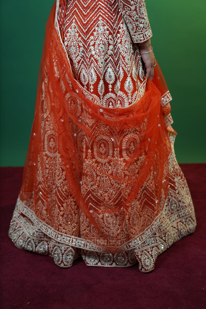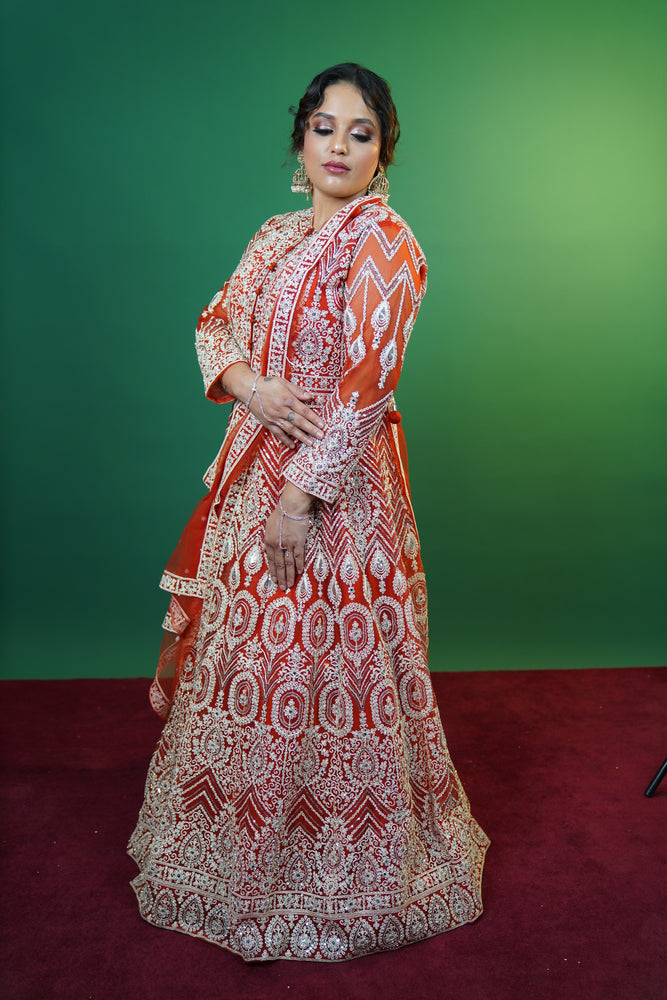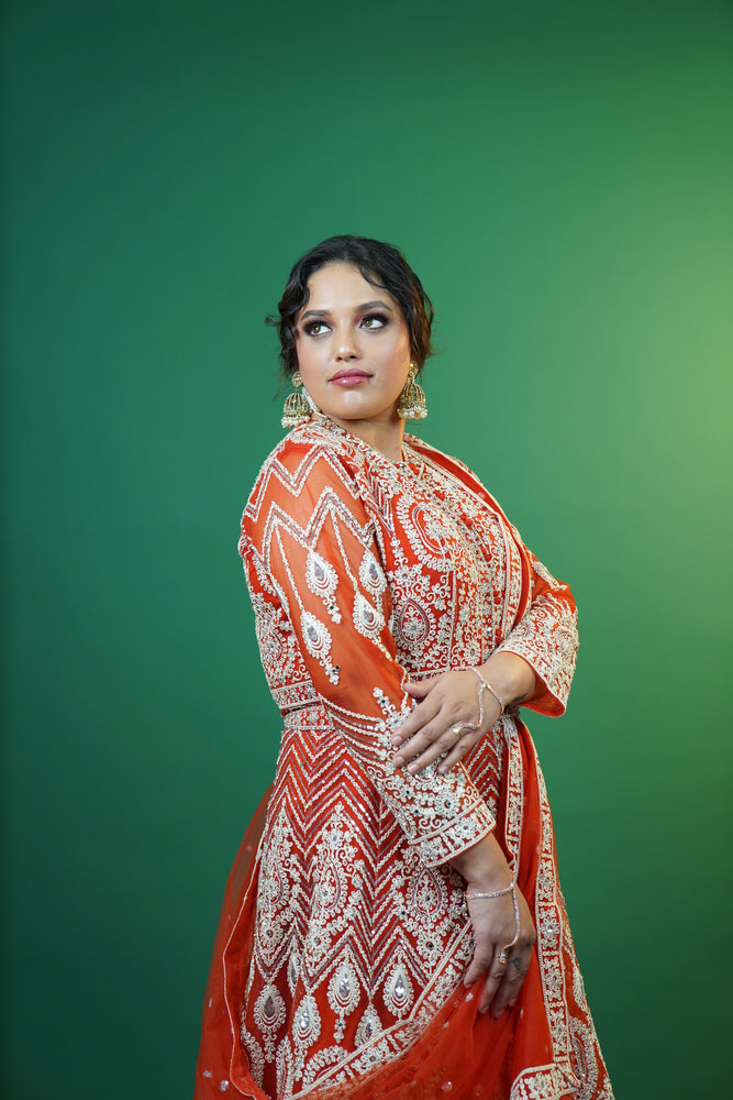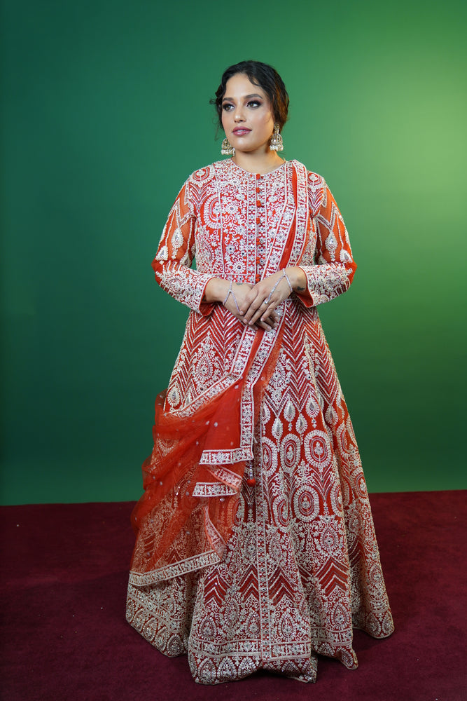 Turn heads with this stunning orange Indo-western gown featuring a trendy front slit and elegant double layers. Made with a soft silk blend inner lining and a stylish net outer layer on the gown, it’s designed for comfort and charm.