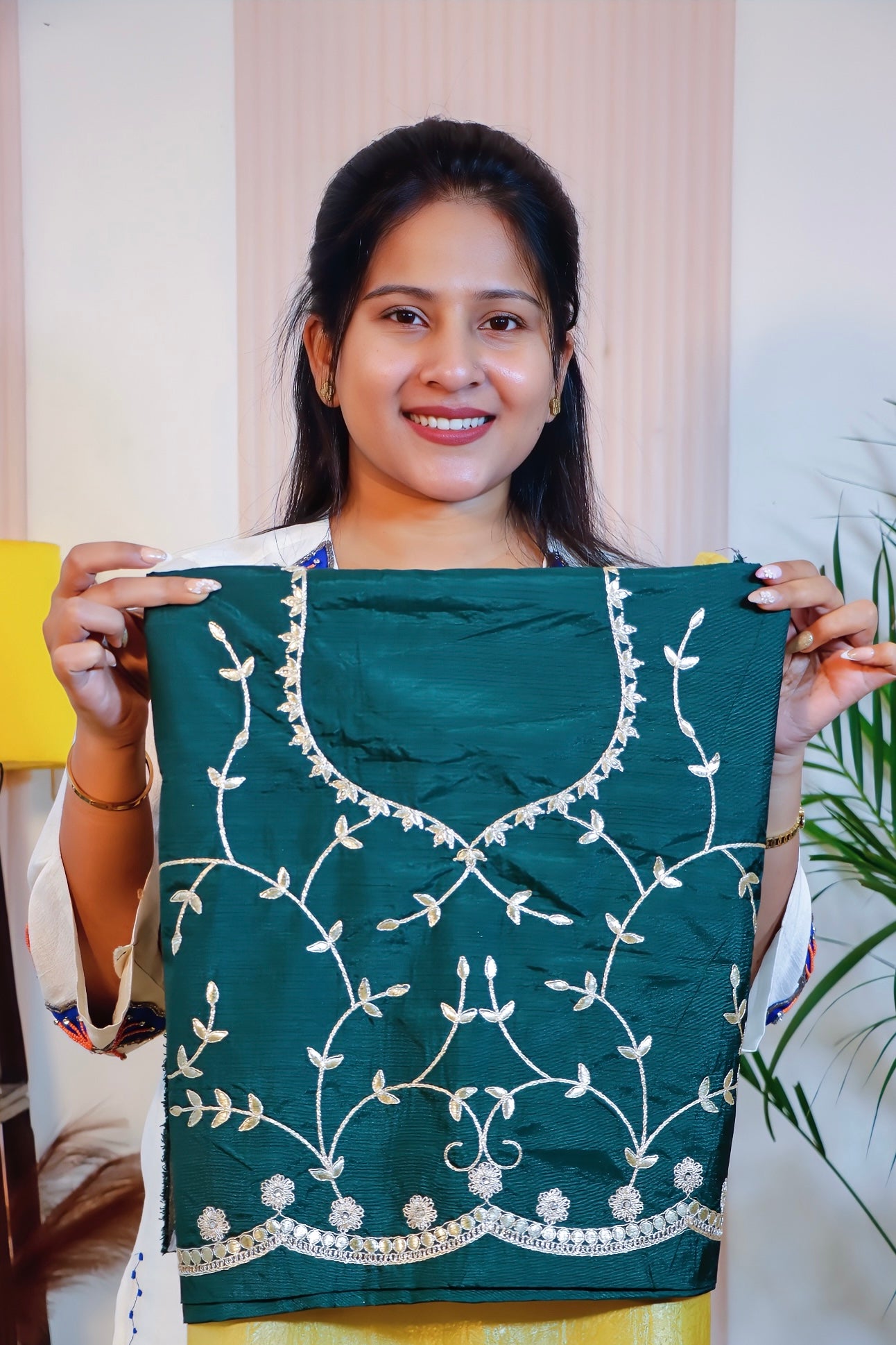 Radiate timeless elegance in this stunning Mustard Yellow Tissue Saree, beautifully adorned with intricate Nag and Gotta Patti work. The rich tissue fabric adds a natural sheen, making it perfect for festive and wedding occasions.