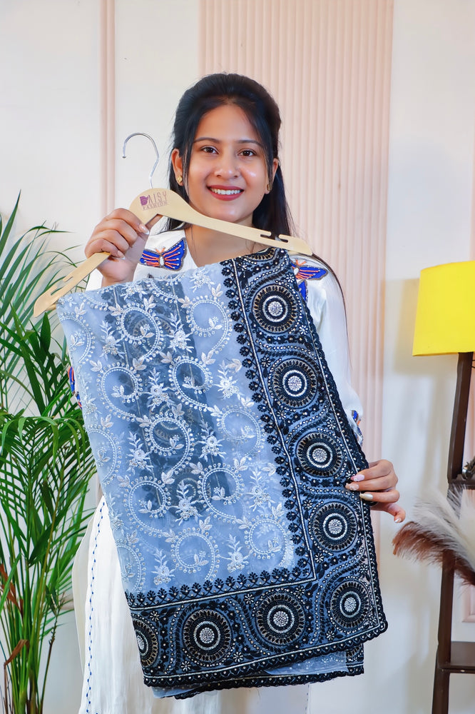 Step into elegance with this exquisite Grey Black Net Saree, beautifully adorned with intricate Thread Embroidery and delicate Nag work. The soft net fabric drapes gracefully, adding a touch of sophistication to your look. Perfect for weddings, festive celebrations, or special occasions, this saree effortlessly combines traditional charm with modern allure.