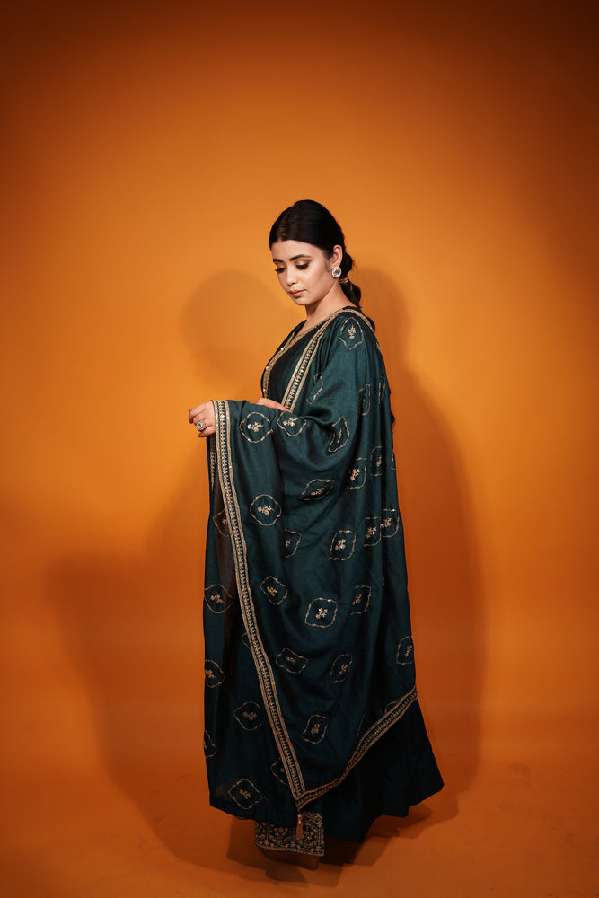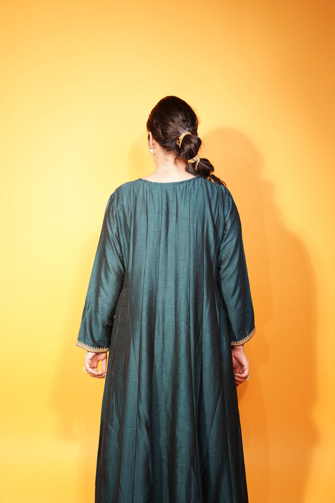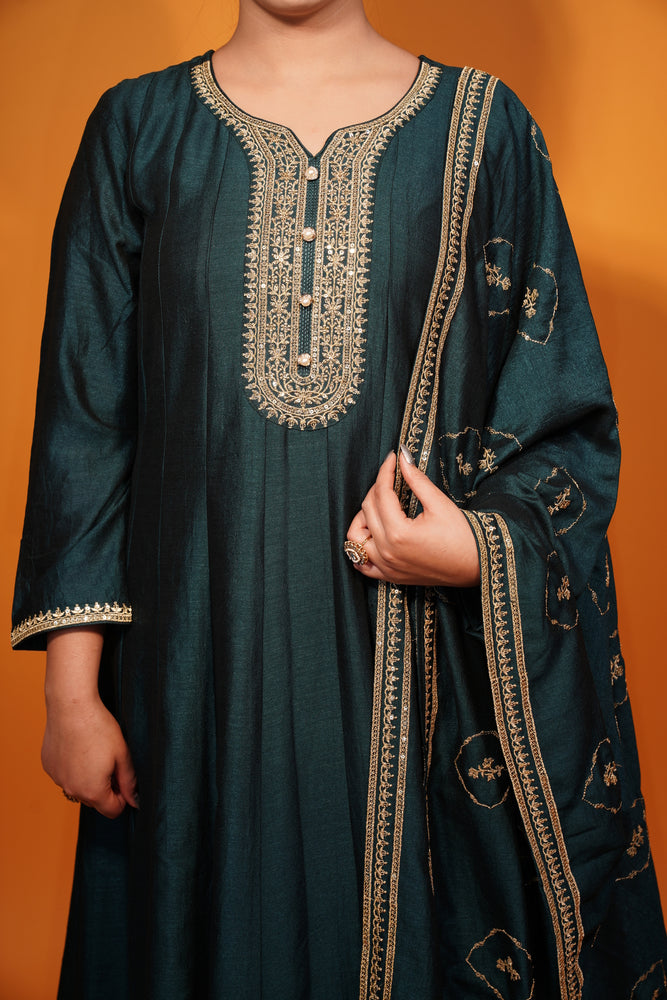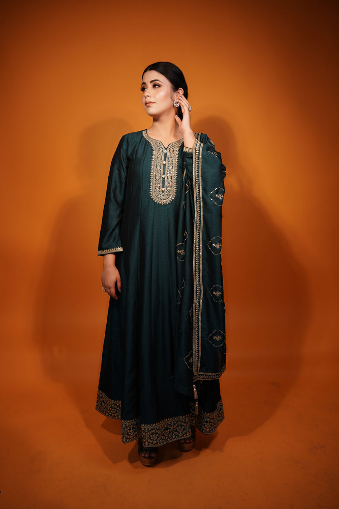 Crafted with Bold colour & Subtle elegance this Dark Green Floor-Length Frock Style Suit is crafted in luxurious Chinon fabric. This Frock suit is beautifully enhanced with delicate zari work, adding a touch of traditional charm and festive sparkle. Flowing and graceful, this outfit is perfect for weddings, parties, or any special occasion where you want to make a statement. A Comfortable yet regal ensemble to own.