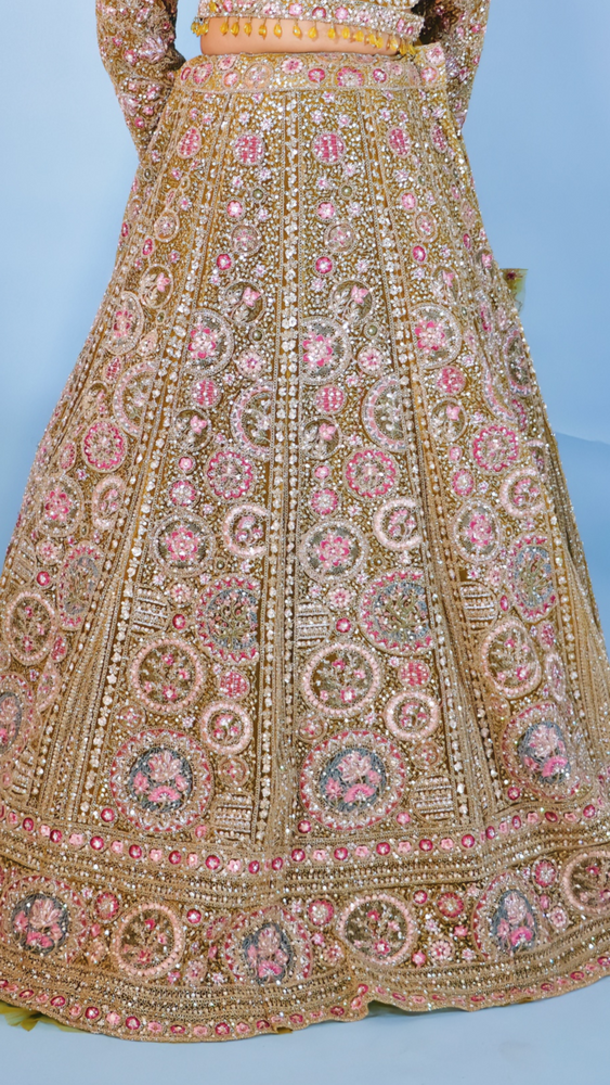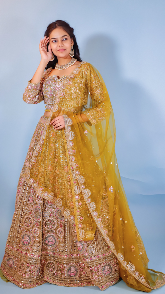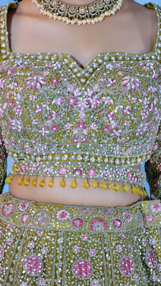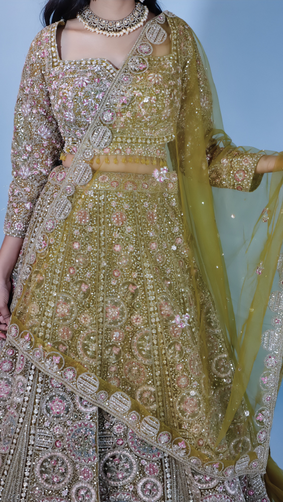 The luxurious detailing enhances its graceful silhouette, while the rich Heena Green shade adds a touch of sophistication and timeless beauty. Whether it’s for a wedding, reception, or festive celebration, this lehenga is designed to make you stand out with unmatched elegance.