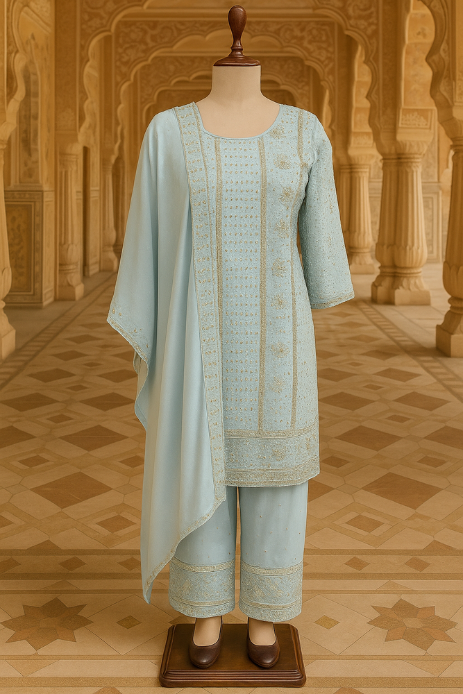 The soft powder blue hue enhances its sophisticated appeal, making it an ideal choice for festive occasions, celebrations, or evening gatherings. Lightweight and flowy, this three-piece set ensures effortless style with a refined finish.