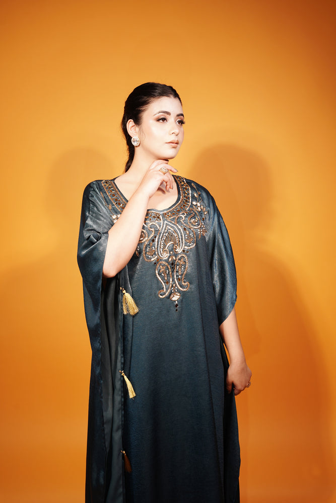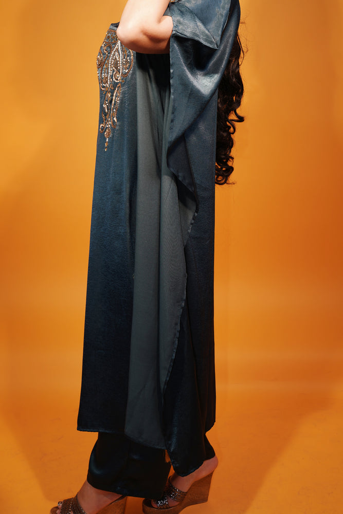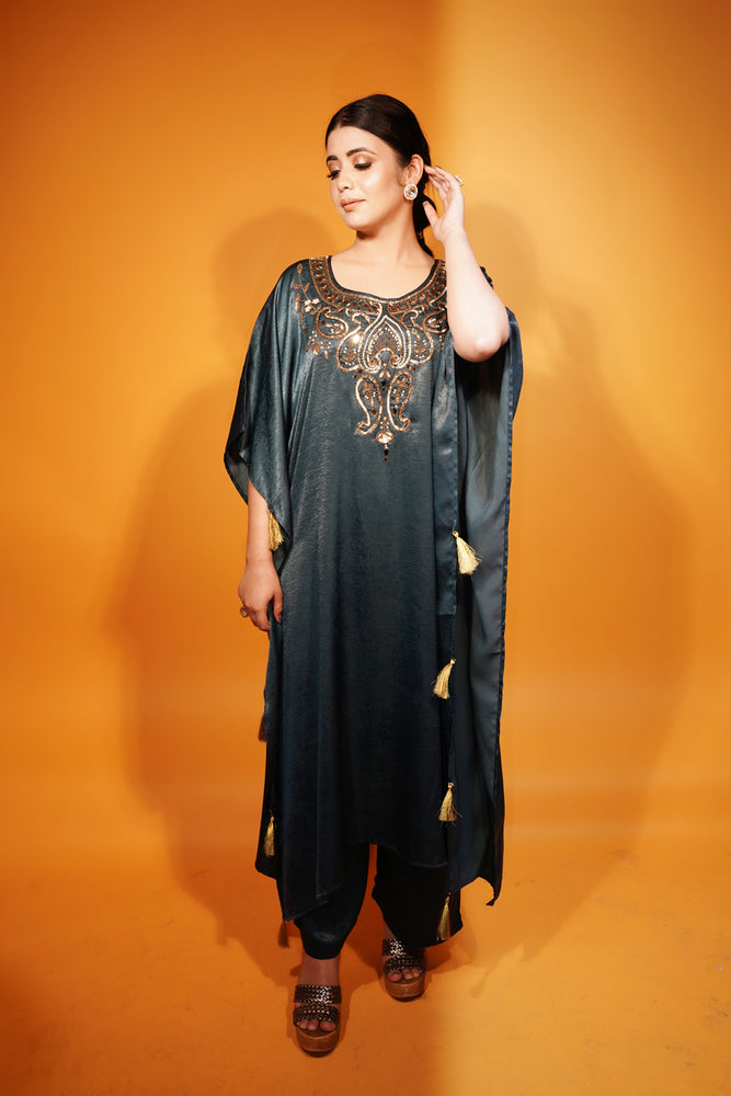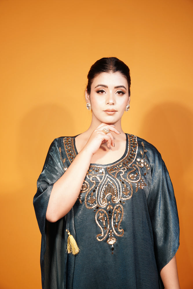 This beautiful Dark Green Kaftan and Pant Set made from soft and rich micro velvet fabric is a goal for fashion at ease. The kaftan-style kurti is designed to make you feel comfortable while looking stylish.