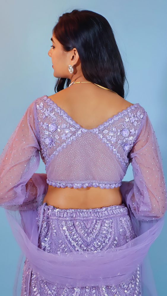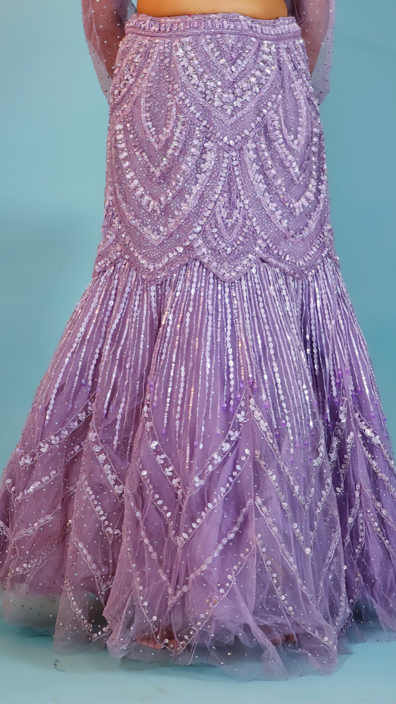 Elevate your festive and party looks with this exquisite Lilac Fish Cut Lehenga paired with a matching Dupatta. Crafted in delicate net fabric, the ensemble features intricate handwork of sequins, beads, and pearls, adding a touch of shimmer and elegance to your wardrobe. The Fish Cut style Lehenga silhouette offers contemporary charm, while the Dupatta adds a graceful, layered appeal. Perfect for weddings, receptions, or special celebrations, this dress ensures you stand out with sophistication and style.