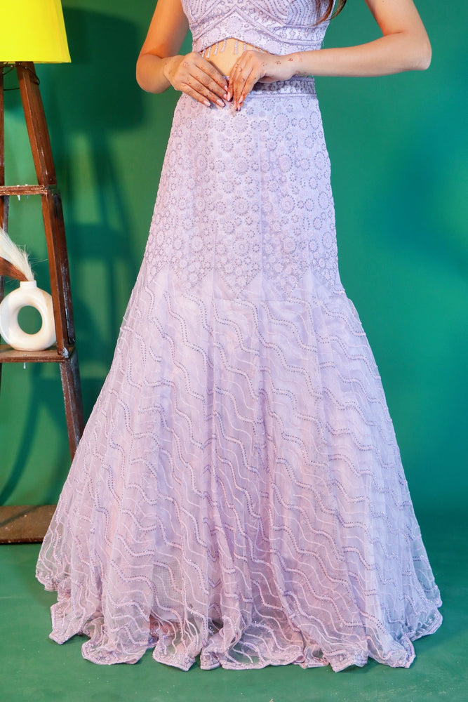 Step into elegance with this stunning Lilac Fish-Cut Crop Top Lehenga, designed to make you stand out at every celebration. Crafted in delicate net fabric, this lehenga exudes sheer sophistication with its graceful fall and structured fish-style silhouette. Adorned with exquisite sugarbead and glitter work, it shimmers beautifully under every light, adding a touch of glamour to your look.