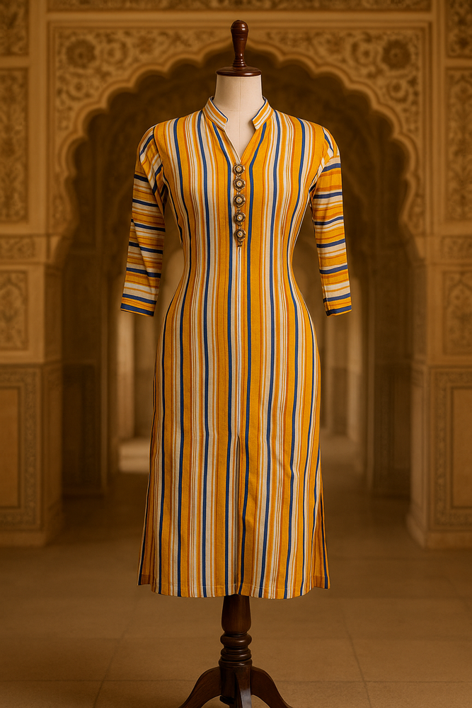 Elevate your everyday style with this vibrant Multicolor Cotton Kurti. Crafted from soft, breathable cotton, it ensures all-day comfort while keeping you effortlessly chic. Adorned with an all-over lining print, this kurti adds a playful yet elegant touch to your wardrobe. Perfect for casual outings, office wear, or festive gatherings, it pairs beautifully with leggings, palazzos, or jeans for a versatile, stylish look.