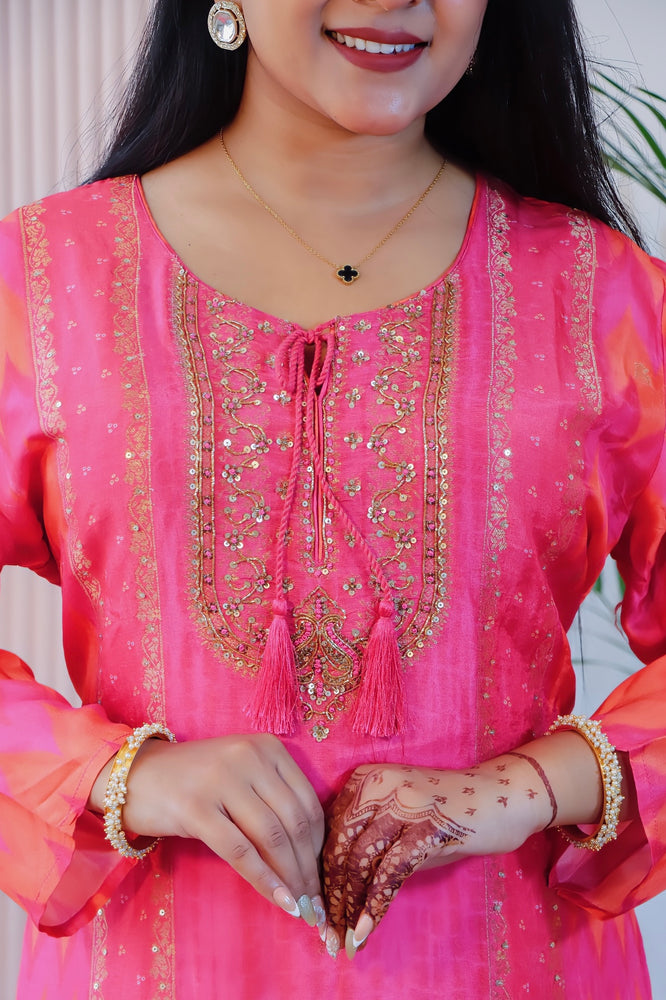 Keep your wardrobe filled with elegance with this beautiful Pink Long Kurti, Plazzo, and Dupatta set. Made from soft and shiny Rayon Silk fabric, the kurti has intricate handwork including Dabka, French knot, Sequins, and Cutdana embroidery for a rich and graceful look. The matching plazzo adds comfort and style, while the lightweight Chiffon dupatta completes the outfit with a soft, flowy touch. Perfect for festive occasions, family functions, or special gatherings.