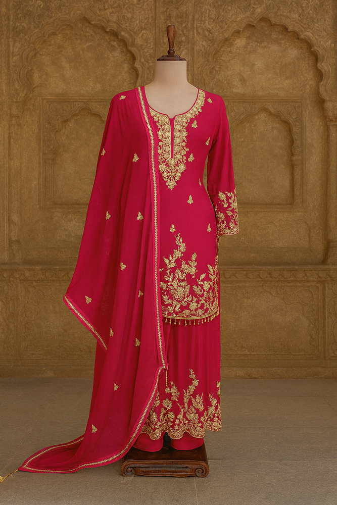 Elevate your ethnic wardrobe with this exquisite Kurti with Palazzo and Dupatta set in a graceful Fusiya Pink shade. Crafted from premium Georgette fabric, this ensemble strikes the perfect balance between elegance and comfort, making it ideal for festive occasions, weddings, and celebrations.