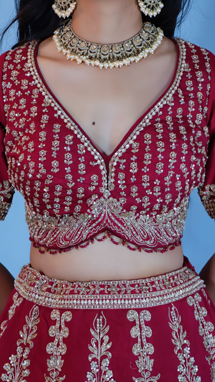Elevate your bridal and festive look with this exquisite Maroon Lehenga crafted in a luxurious blend of raw silk and net fabric. The ensemble is adorned with detailed Dori, Zardozi, Nag, Beads, Sequins, and Cutdana work, creating a rich and regal appeal. The deep maroon hue adds a timeless charm, making it a perfect choice for weddings, receptions, and grand occasions. Paired with a beautifully embroidered blouse and a matching dupatta, this lehenga embodies elegance and grandeur for the modern bride and fashion-forward women.