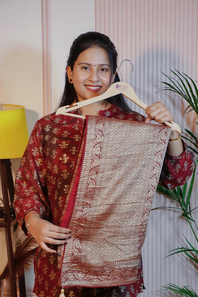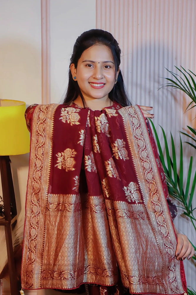 Elevate your festive and wedding wardrobe with this stunning Maroon Georgette Saree, beautifully crafted with all-over zari machine work. The lightweight georgette fabric drapes gracefully, while the rich maroon hue adds a touch of regal charm. Perfect for celebrations, parties, and traditional occasions, this saree blends elegance with modern comfort—making it a must-have addition to your collection.