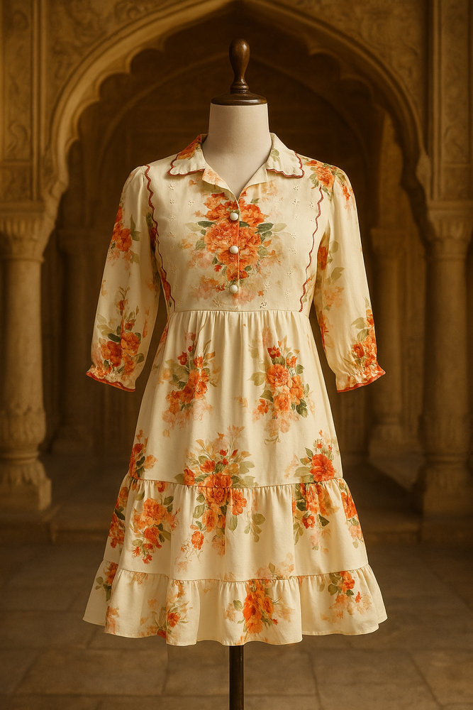 Embrace timeless elegance with our Cream Cotton Midi Dress, beautifully adorned with an all-over floral print for a soft and graceful look. Tailored from premium cotton fabric, this dress ensures a lightweight and breathable feel, perfect for warm days and relaxed outings. The midi length and flowy silhouette add a touch of sophistication, making it an ideal choice for brunches, picnics, or casual get-togethers. Pair it with delicate accessories and sandals for an effortlessly chic appearance.