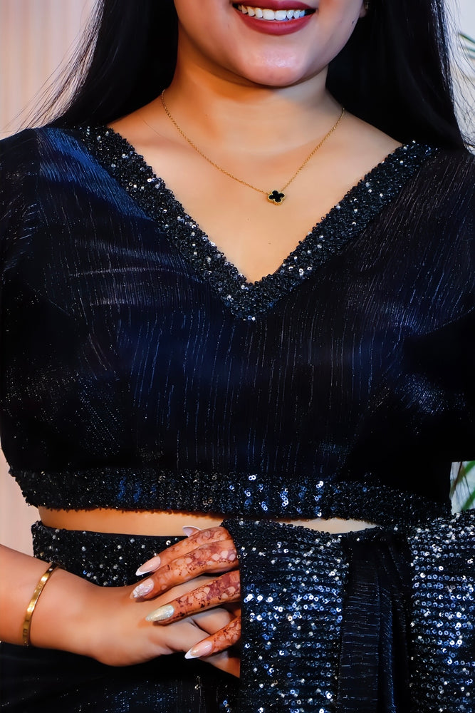 Drape yourself in elegance with this Black Silk Georgette Saree, adorned with delicate sequins and bead work that add a graceful shimmer to your look. Lightweight and flowy, this saree beautifully blends sophistication and charm—perfect for evening parties, receptions, or festive occasions.
