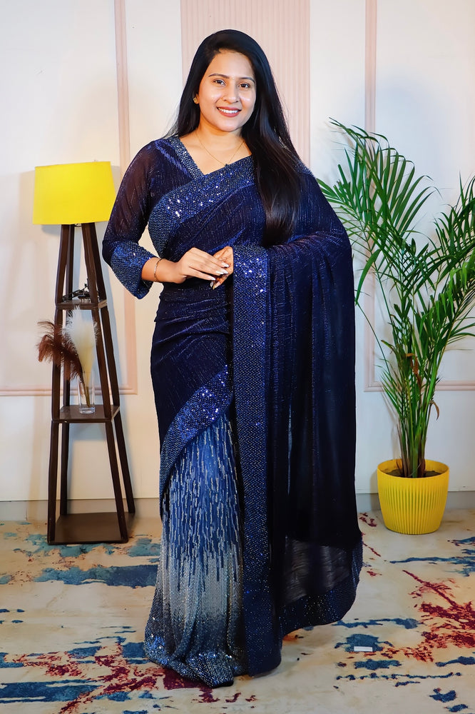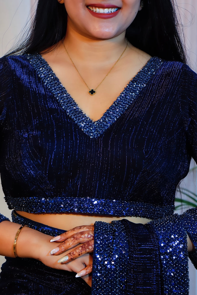 Drape yourself in elegance with this Navy Blue Silk Georgette Saree, adorned with delicate sequins and bead work that add a graceful shimmer to your look. Lightweight and flowy, this saree beautifully blends sophistication and charm—perfect for evening parties, receptions, or festive occasions.