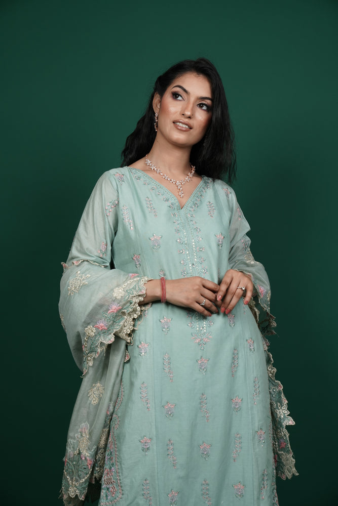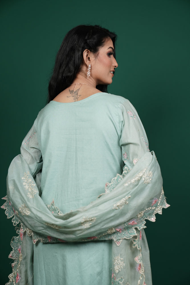 Mint Green Cotton Kurti Set with Thread Embroidery & Sequins Work