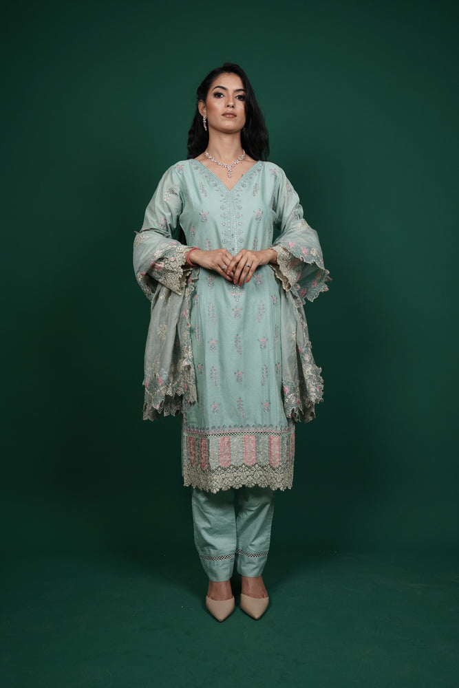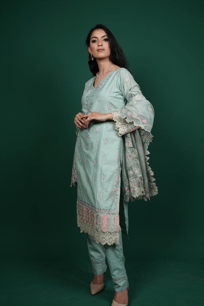The matching cotton pants are tailored for a flattering fit, ensuring both ease and elegance. What truly elevates this ensemble is the cotton mesh dupatta, designed to add a light and graceful finish to your overall look.