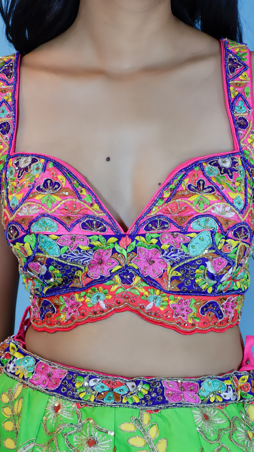 Make a dazzling entrance with this vibrant Multicolor Silk Blend Lehenga, a perfect blend of tradition and contemporary style. Crafted in luxurious silk blend fabric, this lehenga features intricate thread embroidery, shimmering mirror work, and delicate foil prints, enhanced with subtle sequin detailing for that extra sparkle. The multicolor palette adds a festive and lively touch, making it ideal for weddings, receptions, or special celebrations. Pair it with a matching blouse and dupatta to complete a look that radiates elegance and charm.
