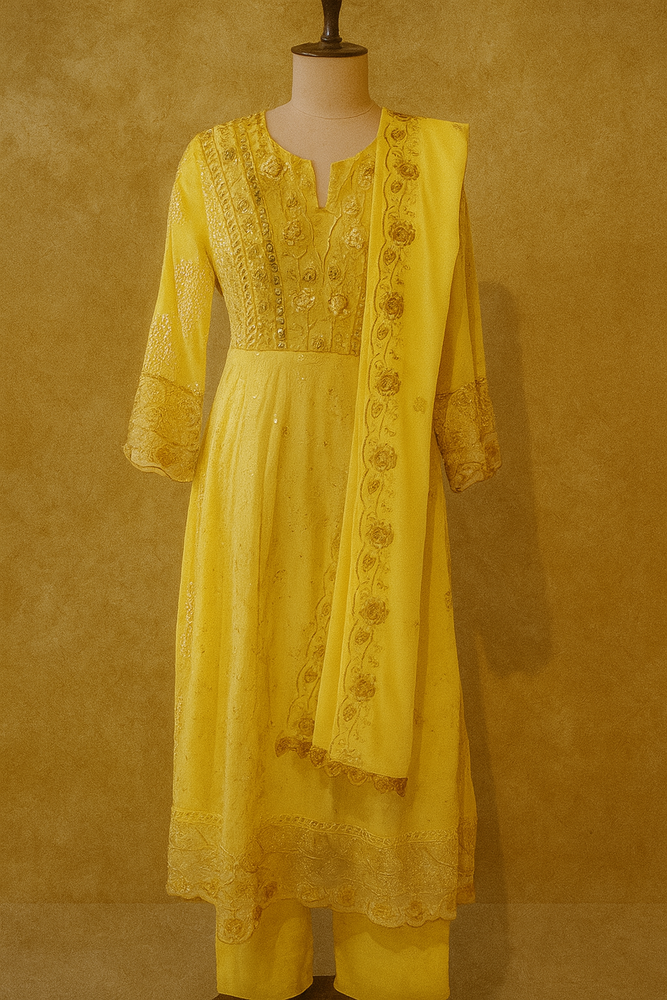 Mustard Yellow Embroidered Kurta Set with Floral Dupatta