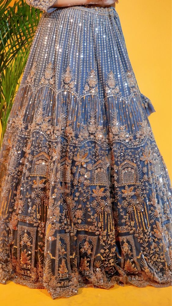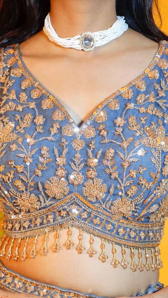 The stylish crop top pairs effortlessly with the flowing lehenga skirt, making it perfect for weddings, receptions, festive occasions, and cocktail parties. Its dreamy color palette of bluish grey and teal blue creates a sophisticated yet vibrant appeal.