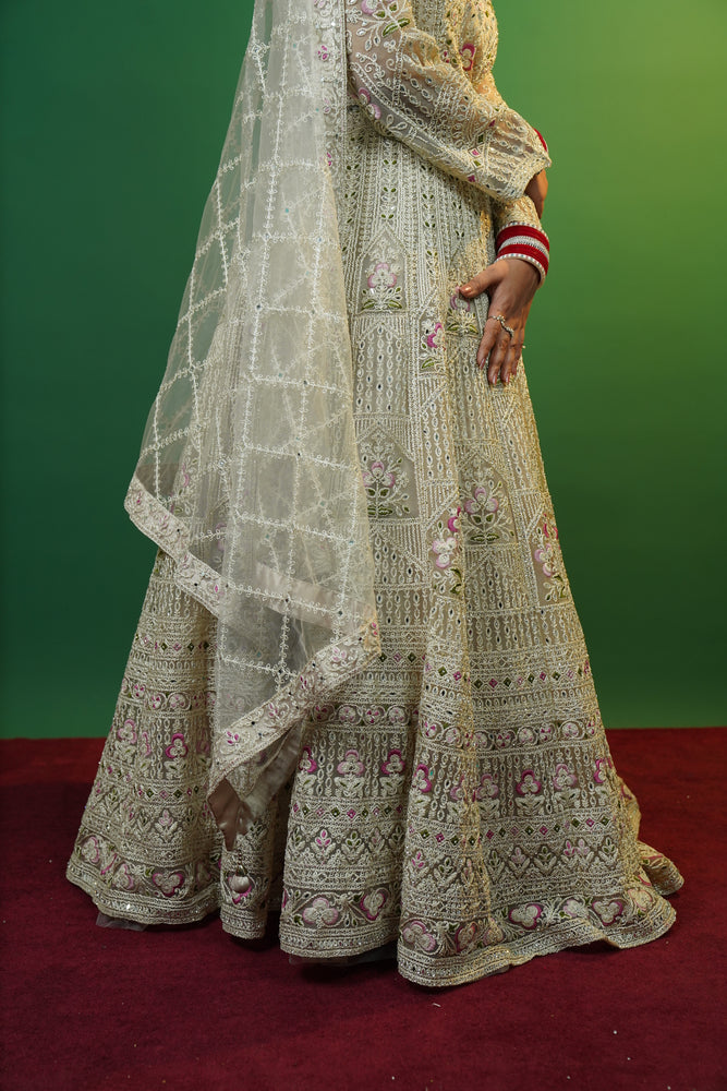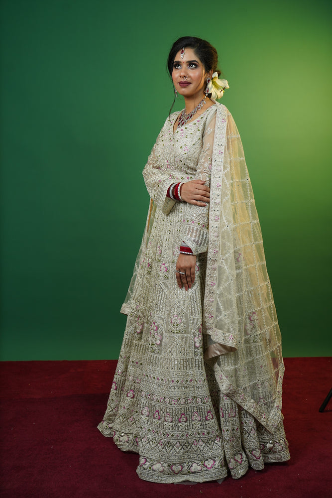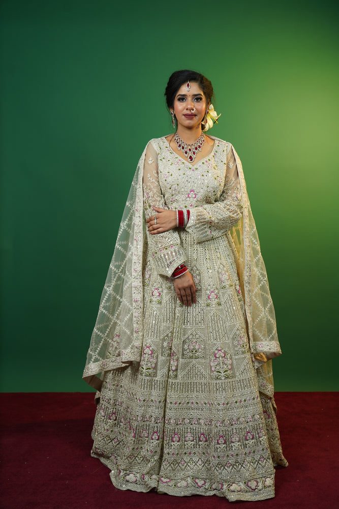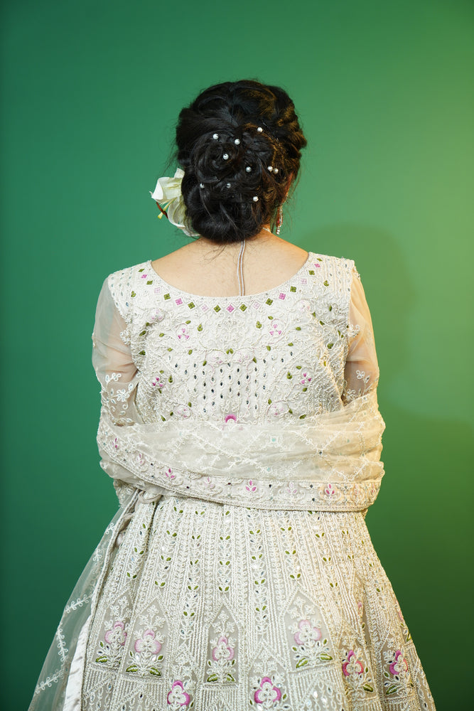 Serving modern maharani realness with Full sleeve crop top and jaal work on dupatta. Accessorize with kundan or white stone statement pieces to level up the royal charisma.
