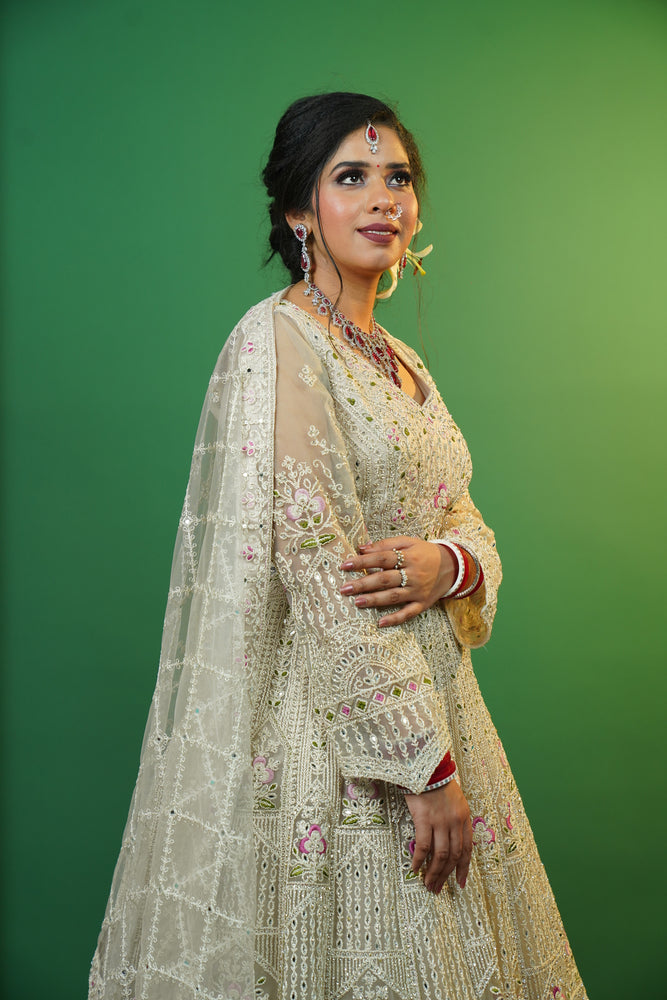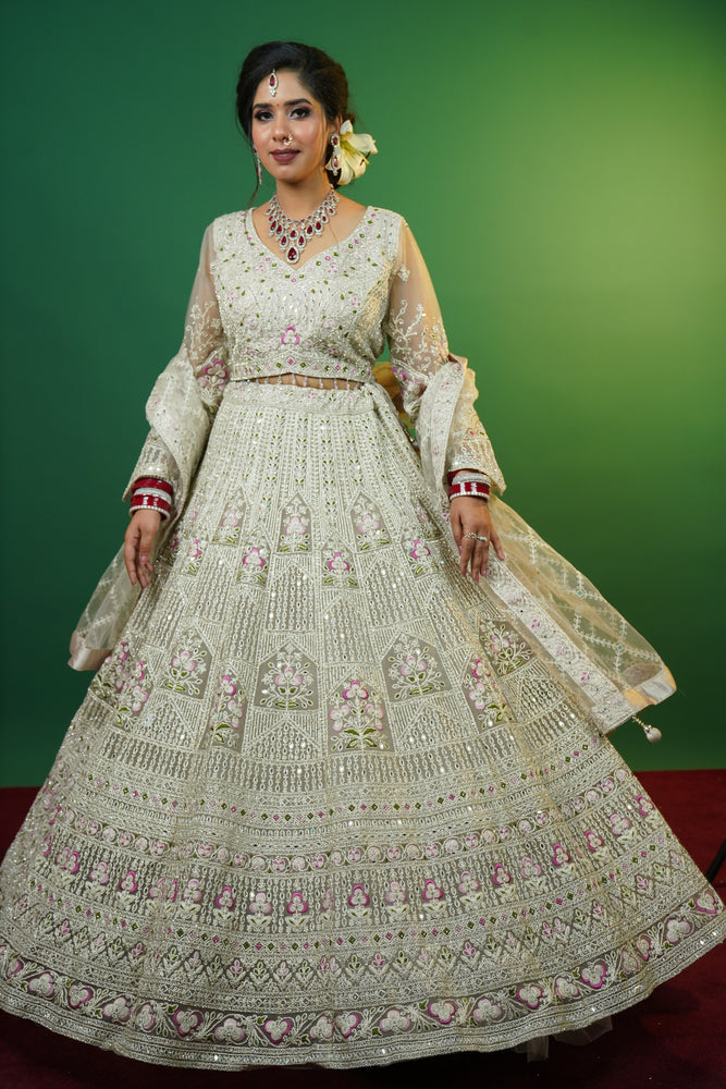 This off-white crop top lehenga is a soft dream crafted in dori, thread, and sparkle.