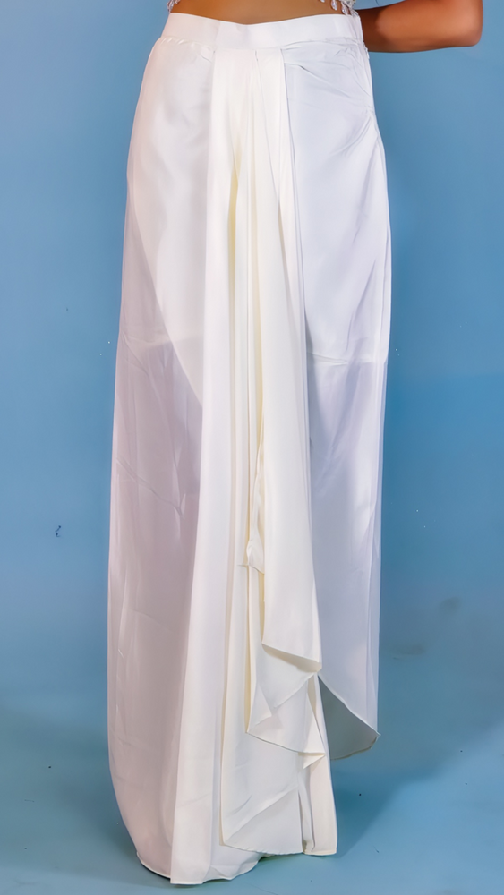 Step into elegance with this stunning Off-White & Green Dhoti Style Dress, paired with a matching shrug. Crafted from luxurious satin, this ensemble exudes a perfect blend of contemporary design and traditional charm. The dhoti-style silhouette offers comfort and style, while the intricate detailing of pearls, sequins, beads, and zari work adds a touch of opulence. The coordinating shrug enhances the overall grace, making it perfect for festive occasions, weddings, or special events. Elevate your wardrobe with this exquisite piece that promises to turn heads wherever you go.