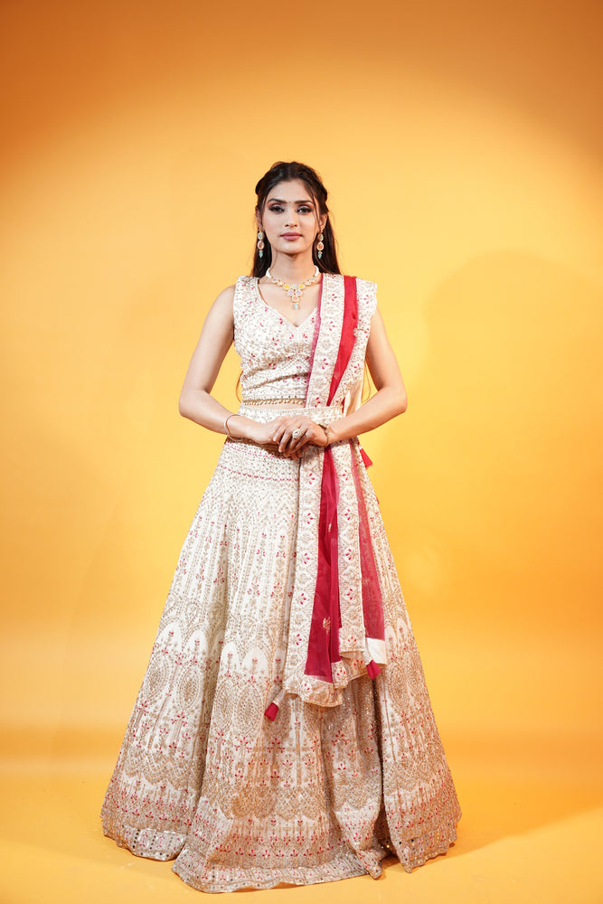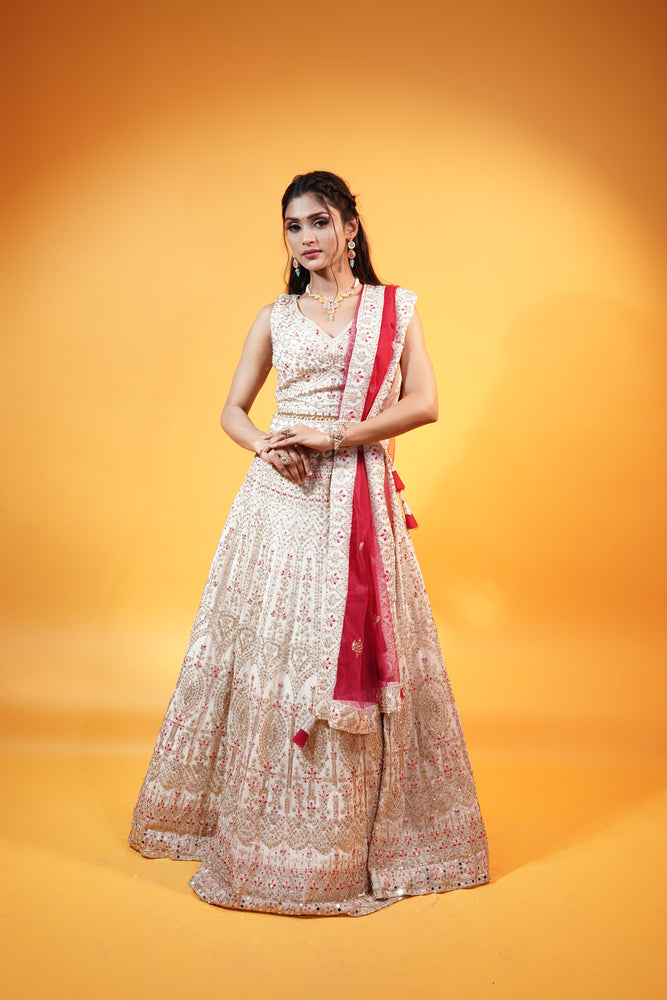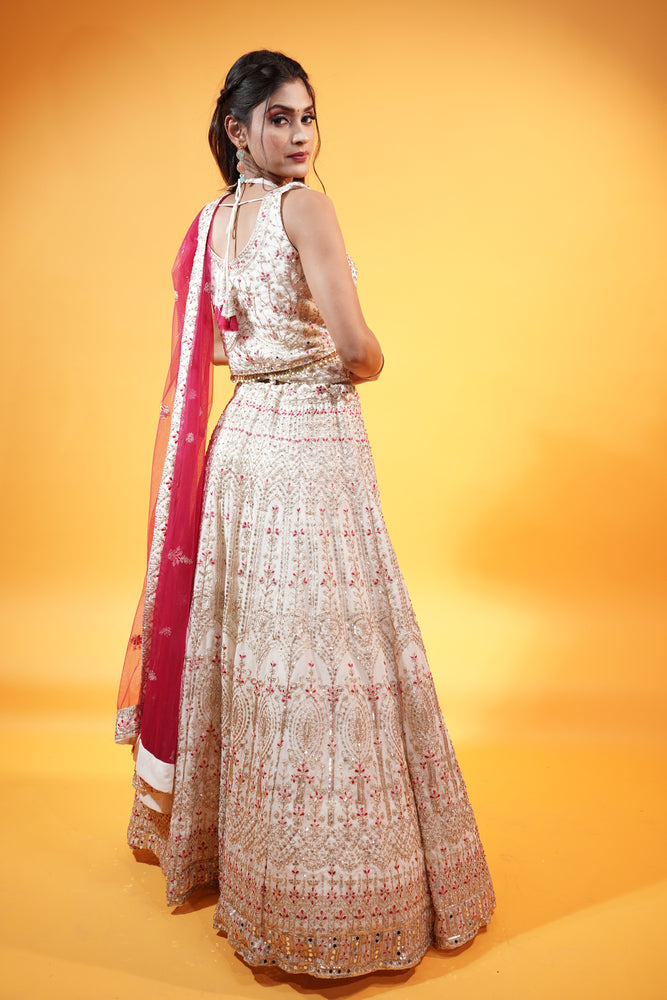 Then this Off White Lehenga with Pink Dupatta is your partner in disguise. The Off white Lehenga and Crop top in georgette fabric is crafted with delicate thread & zari Embroidery with dori, sequins and stone work in it. The Pink Dupatta in net fabric add a contrast to the overall Lehenga. A perfect fit for ladies who love to wear graceful colours.