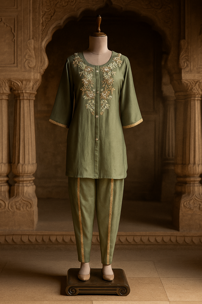Make a graceful style statement with this elegant Cord Set featuring a Kurti and Tulip Pant in a soft onion pink hue. Crafted in luxurious Chinon fabric, the kurti is adorned with delicate Cut Dana embroidery that adds a subtle shimmer and intricate detail. The tulip pants bring a contemporary twist to the traditional fit, making it perfect for festive gatherings, celebrations, or a stylish day out.