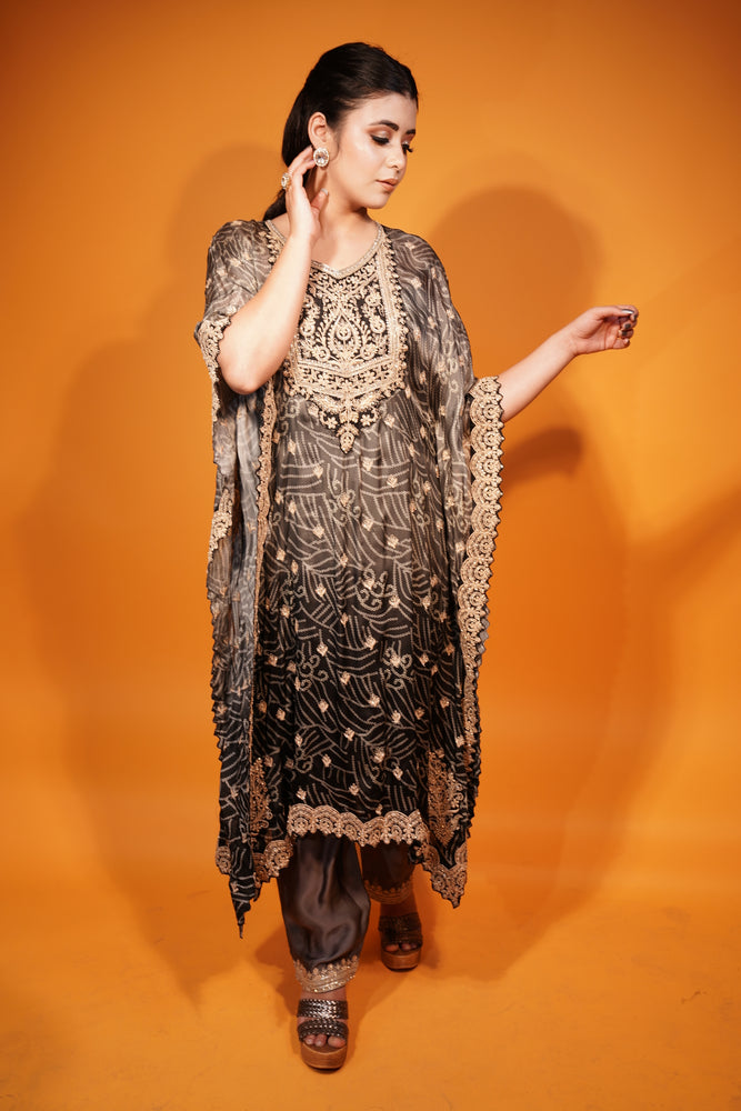 Be a Fashion icon with this elegant Kaftan and Pant Set crafted from soft and flowy crape fabric.